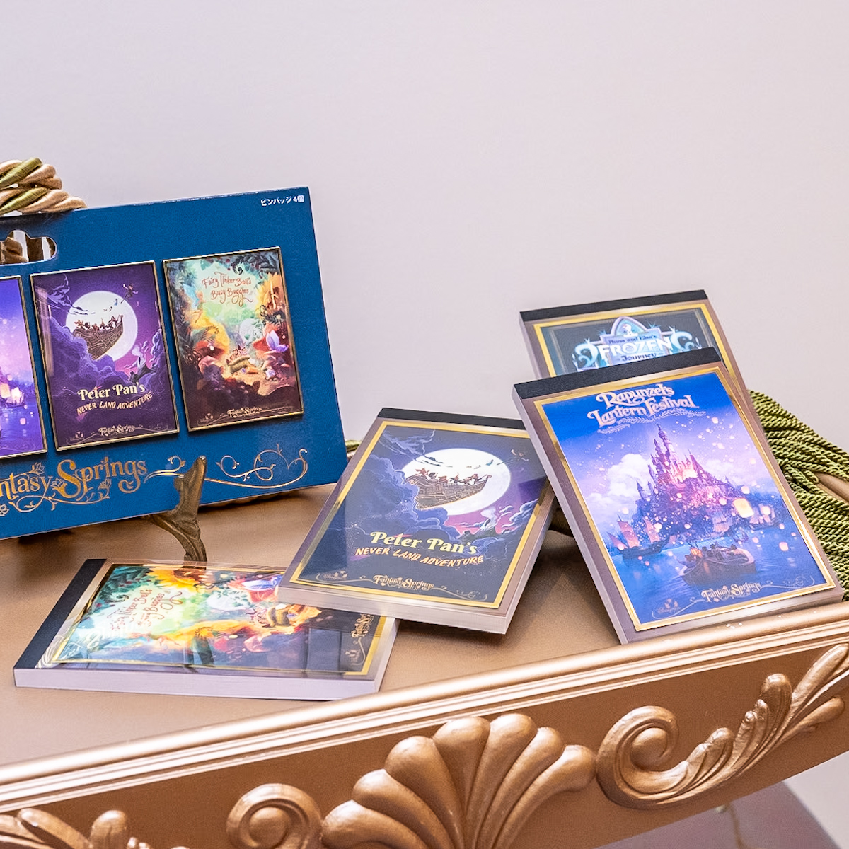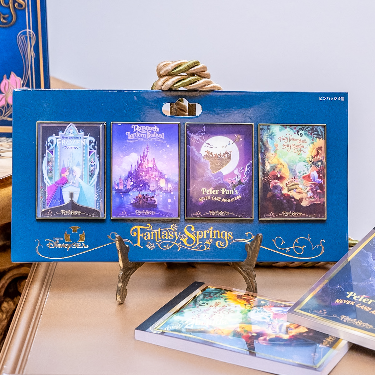 「ファンタジースプリングス」のエリア内にあるアトラクションのポスターがデザインされたピンバッジ4個セット。