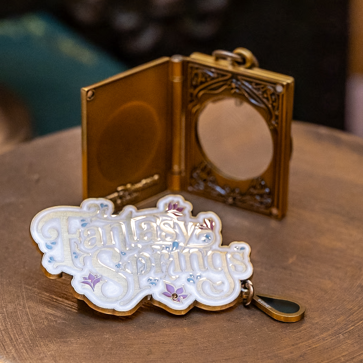「ファンタジースプリングス」のロゴがデザインされたピンバッジ。