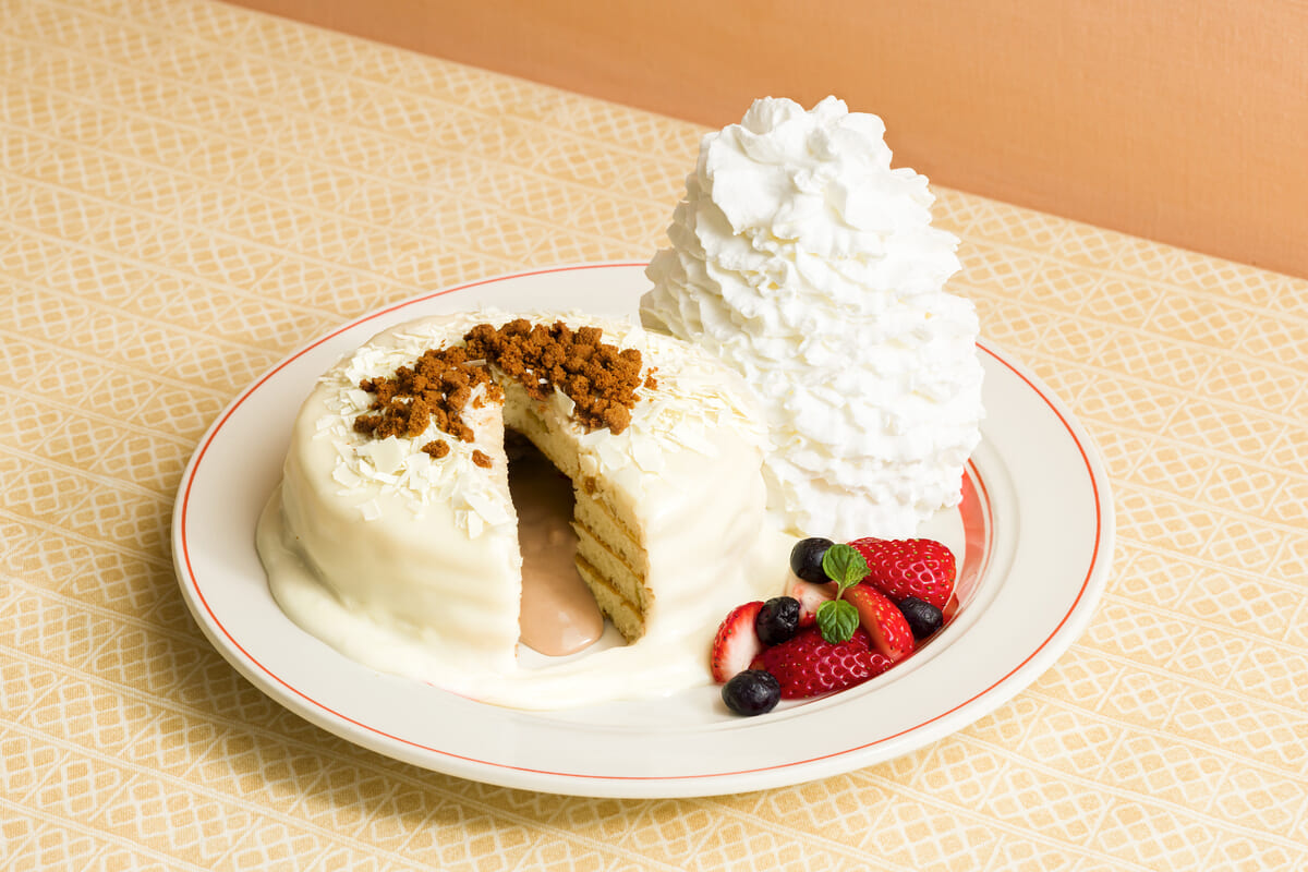 真っ白なホワイトチョコレートクリームに包まれた生地の中から温かいチョコレートクリームが流れ出すホワイトデーならではのパンケーキです。