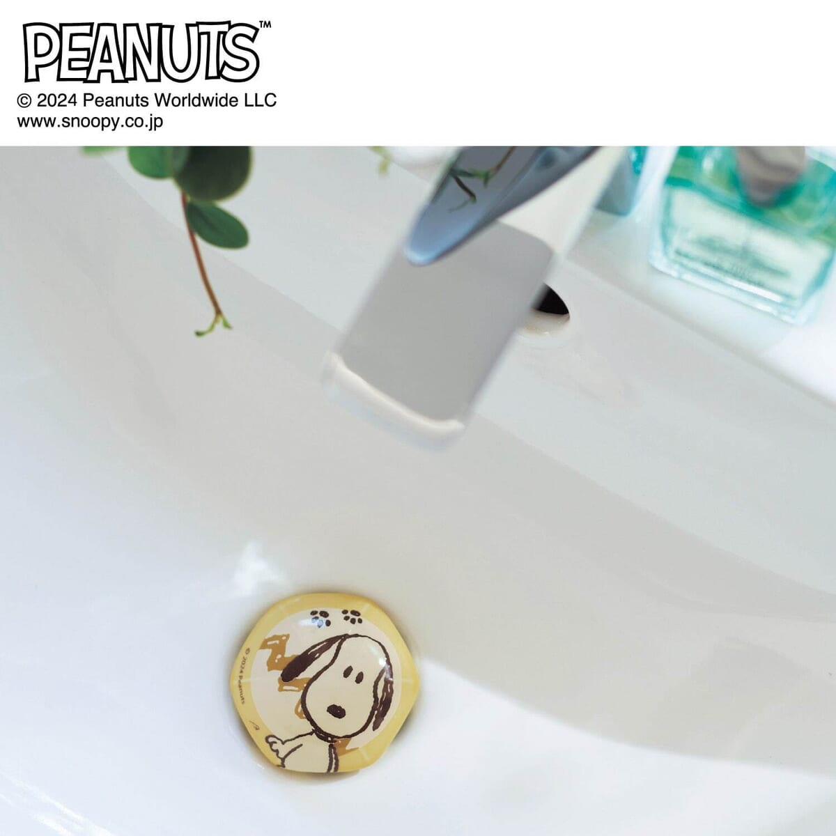 排水口を目隠しでき、水はねも防止してくれる「スヌーピー」デザインのサニタリー。