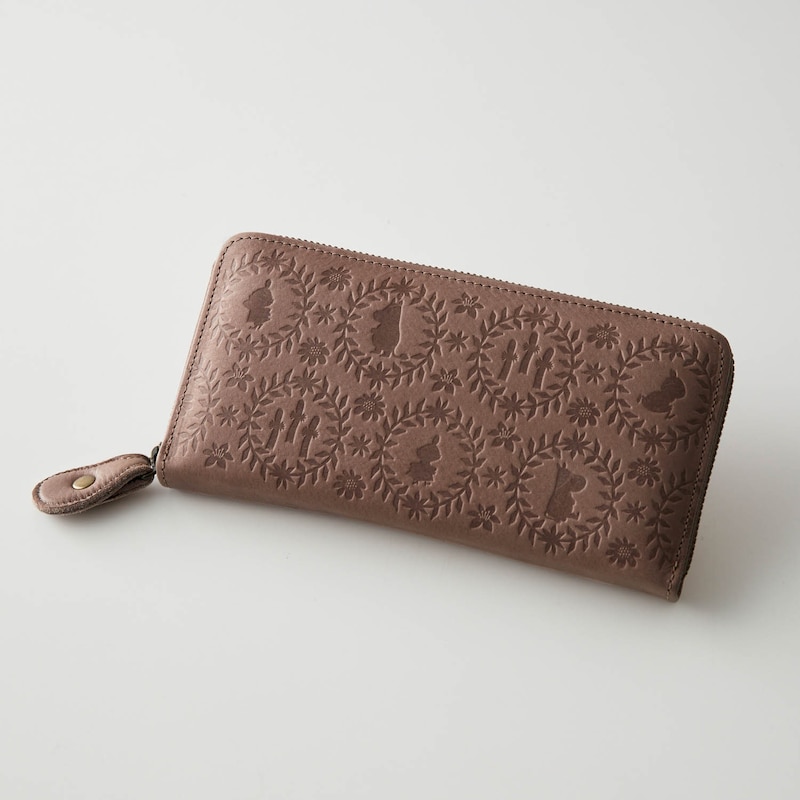 「ムーミン」たちのシルエットの型押しデザインを使用した本革長財布。