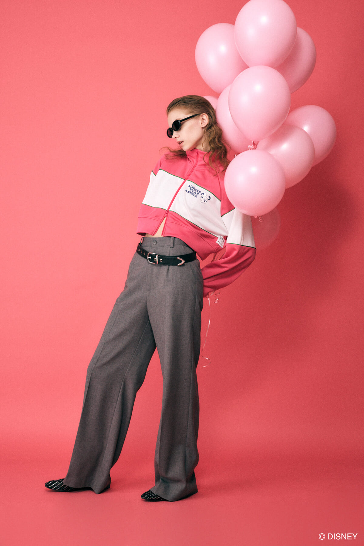 左胸に「ミニーマウス」のお顔がプリントされた、配色切り替えがポイントのクロップド丈トラックジャケットなどが展開されます。