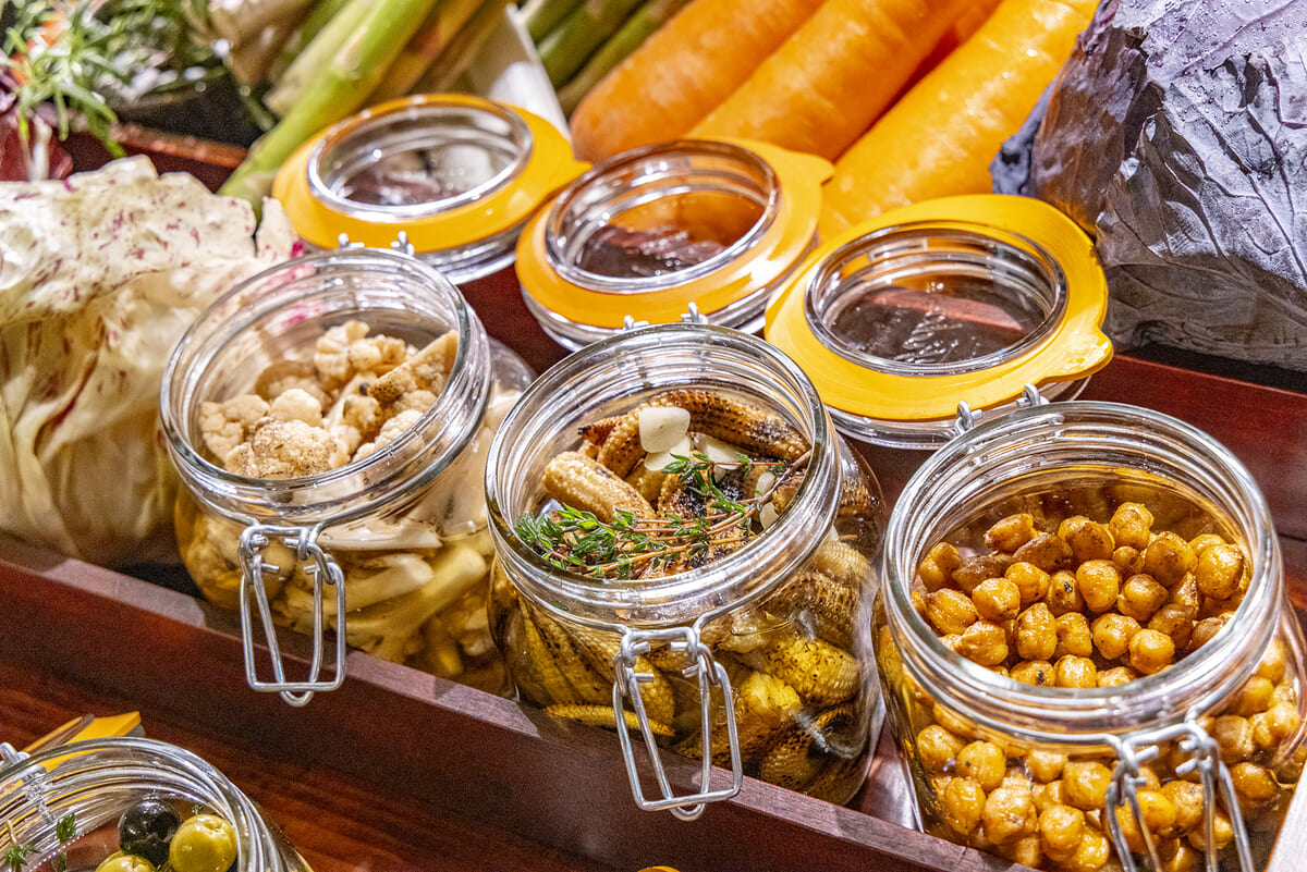 スモーキーな香りをまとった野菜の自家製マリネやピクルス
