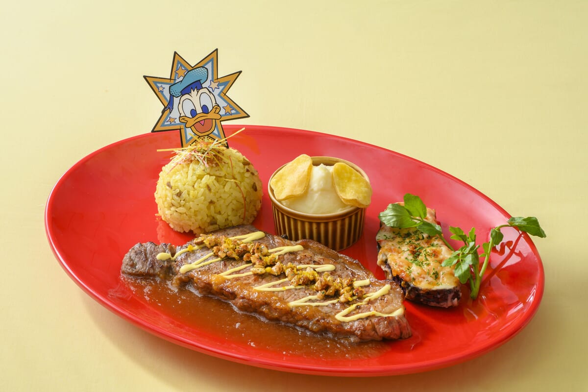 「ドナルドダック」をイメージしたカラーをちりばめたステーキプレート。