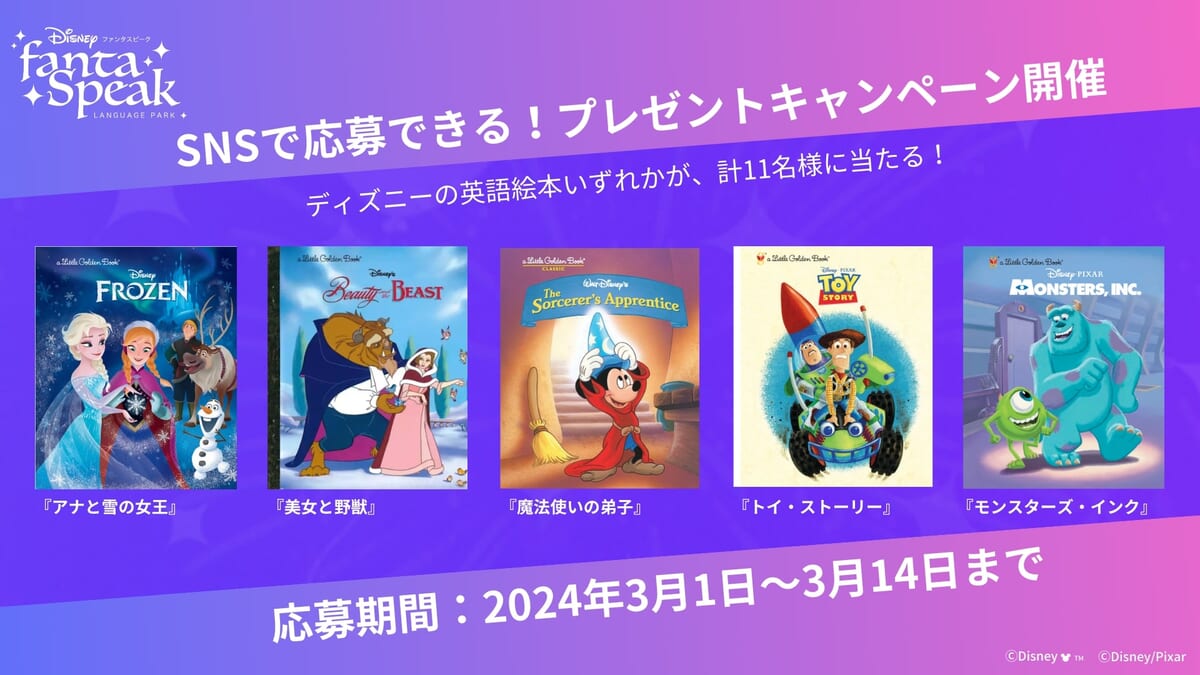 キャンペーンに応募された方の中から抽選で、ディズニーやピクサーを代表する人気作品の英語絵本をプレゼント。