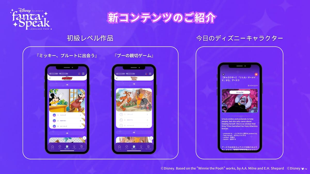 継続して学びやすい「初級レベル作品」のほか、ワクワク学べる「今日のディズニーキャラクター」が追加されています。