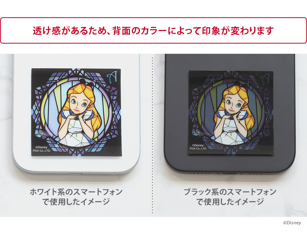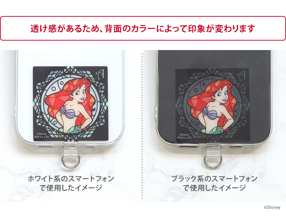 ディズニーキャラクターたちの美麗アートを使用したステンドグラス風デザインが上品なスマートフォンアクセサリー。