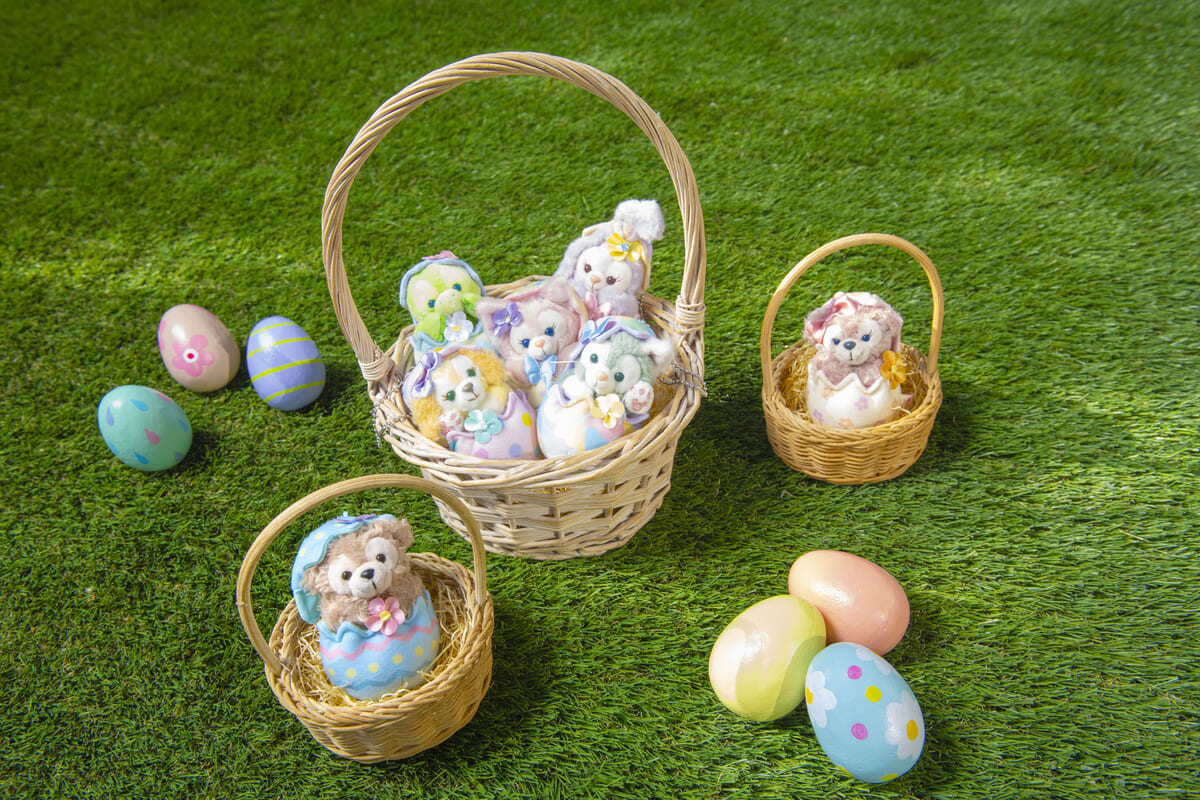 ダッフィー、ジェラトーニ、クッキー・アン、リーナ・ベルがエッグハントを楽しむ様子をデザインしたグッズやスーベニア付きメニューが期間限定で登場します。