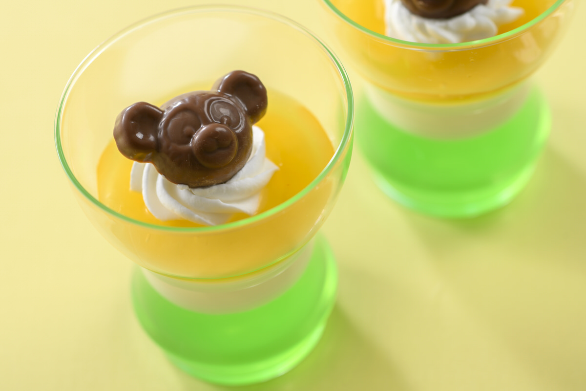 スーベニアカップを付けることができるアップルゼリー&ヨーグルトムースは、ダッフィーのお顔をのせたグラススウィーツ。