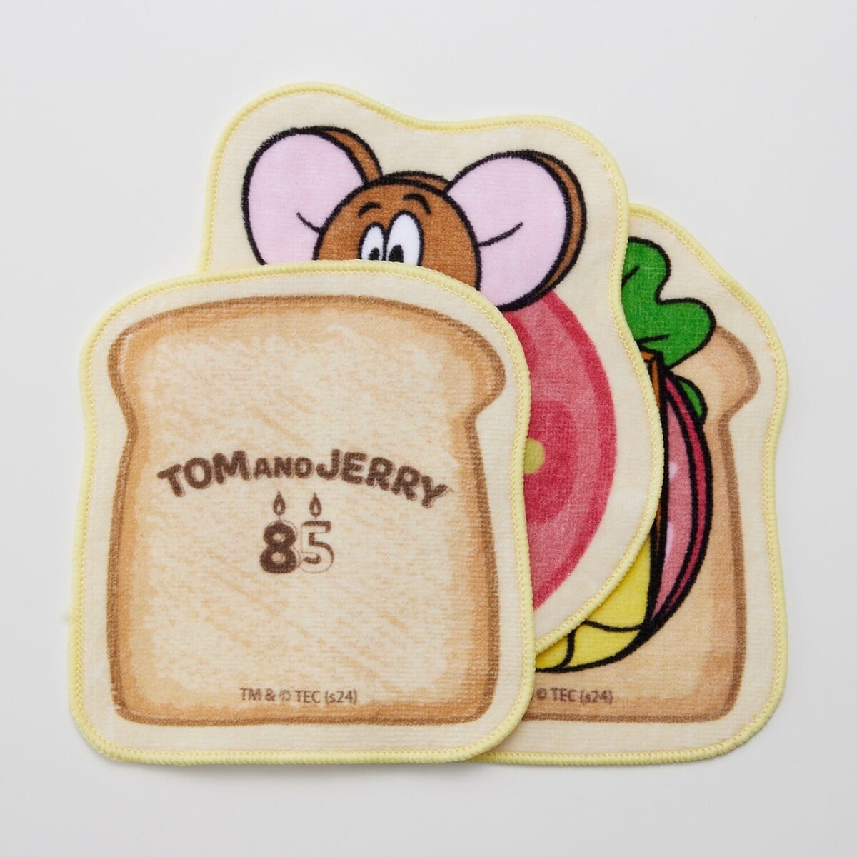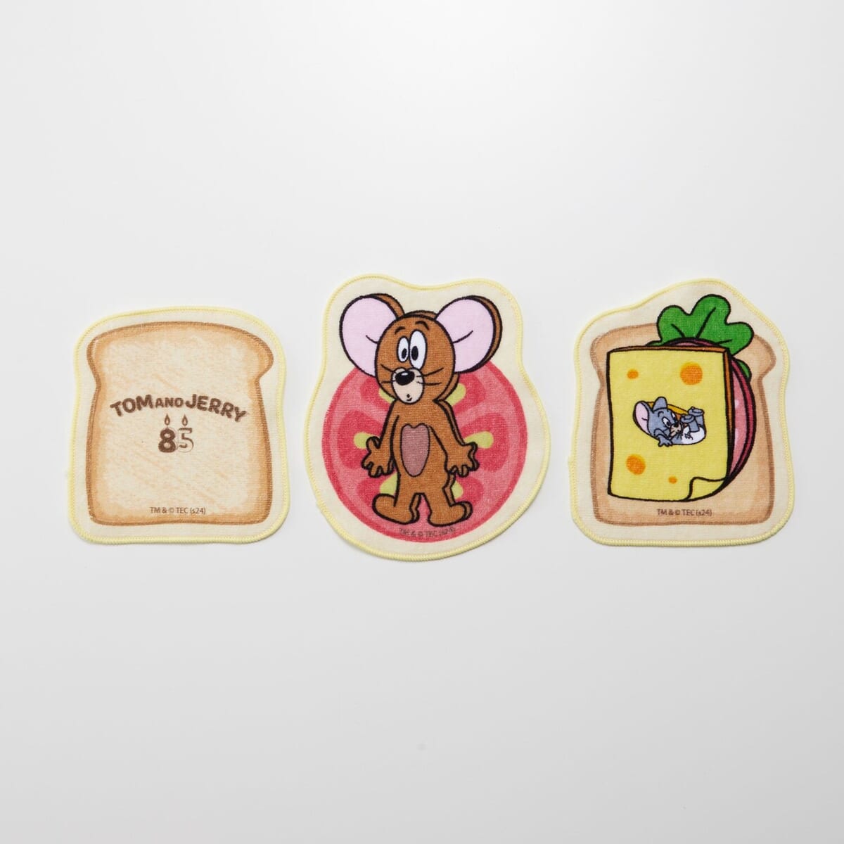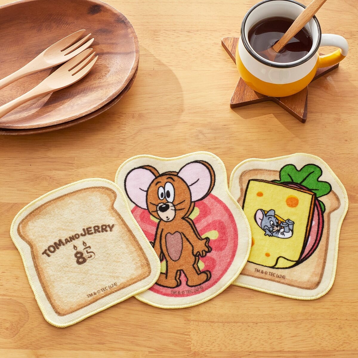 3枚重ねるとまるでサンドイッチのようなデザインになる、『トムとジェリー』のミニハンカチタオル3柄セットがベルメゾンに登場。
