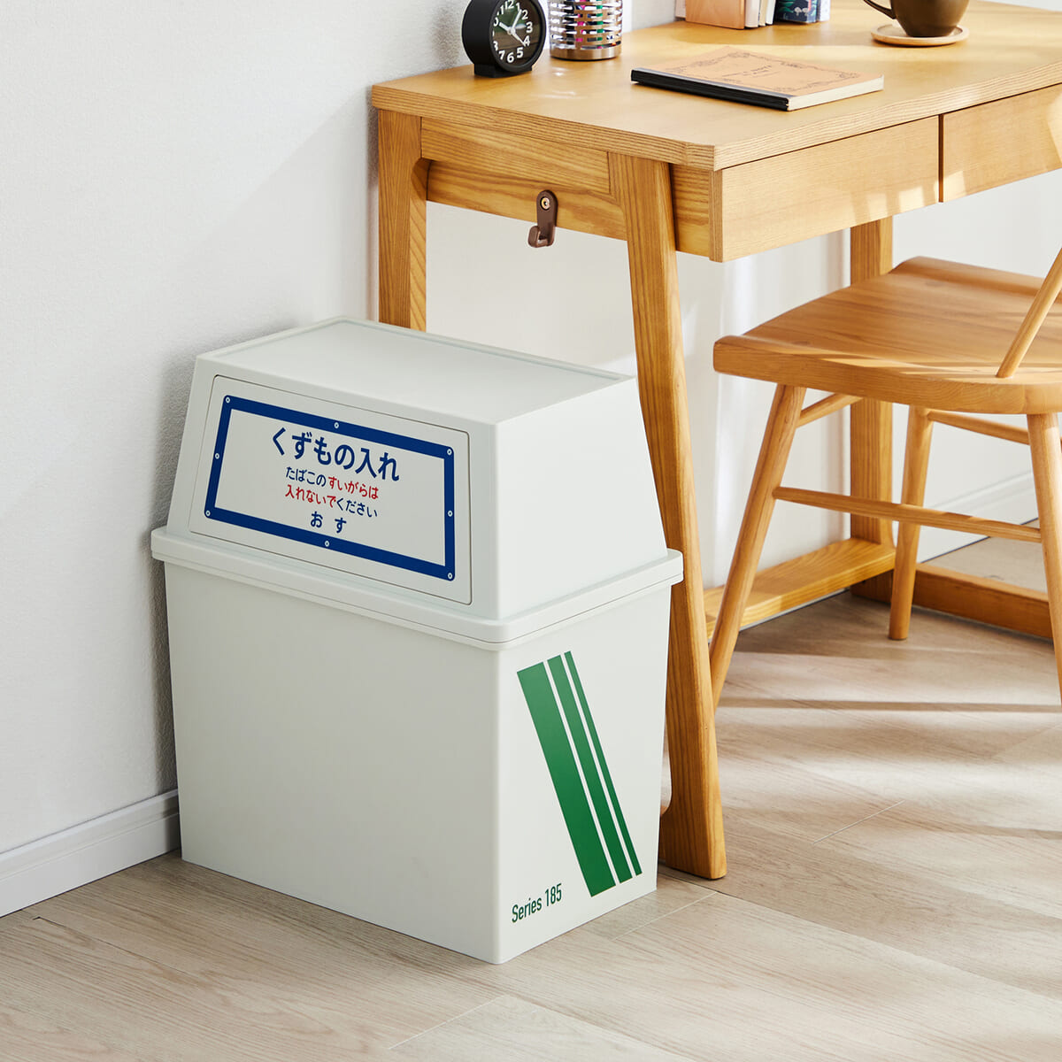 列車に備えつけられていた「くずものいれ」を再現したダストボックス。