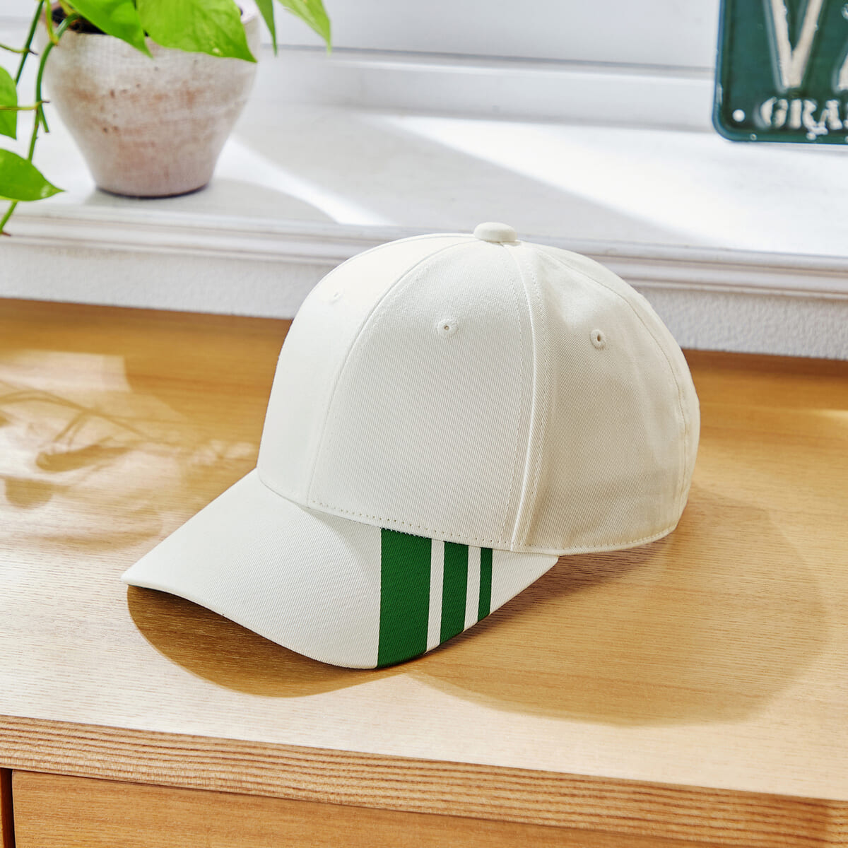 片側のサイドに「緑ストライプ」をあしらった、カジュアルなキャップ。