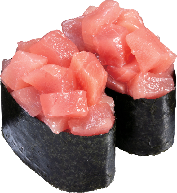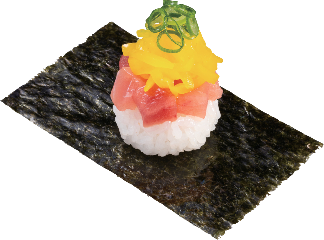 「みなみ鮪とろたく包み」は、みなみ鮪とろぶつの甘みに、たくあんの味わいや食感を加えたお寿司。