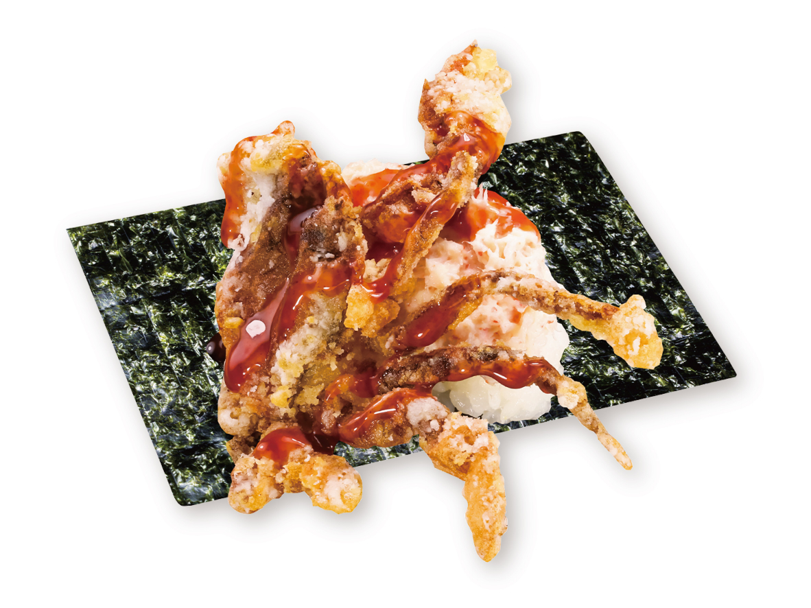 風味豊かな海苔の上に、シャリとまろやかなコクがある紅ズワイガニのカニマヨ、カニの旨みを丸ごと味わえるソフトシェルクラブの唐揚げを乗せた手巻きです。