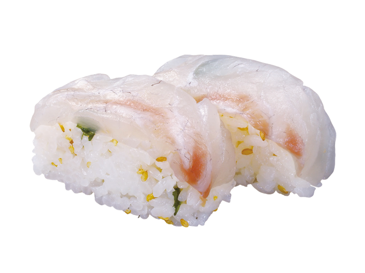 シャリには胡麻と大葉を混ぜ、大葉の爽やかな香りと真鯛の甘みがぎゅっと詰まった押し寿司にしています!