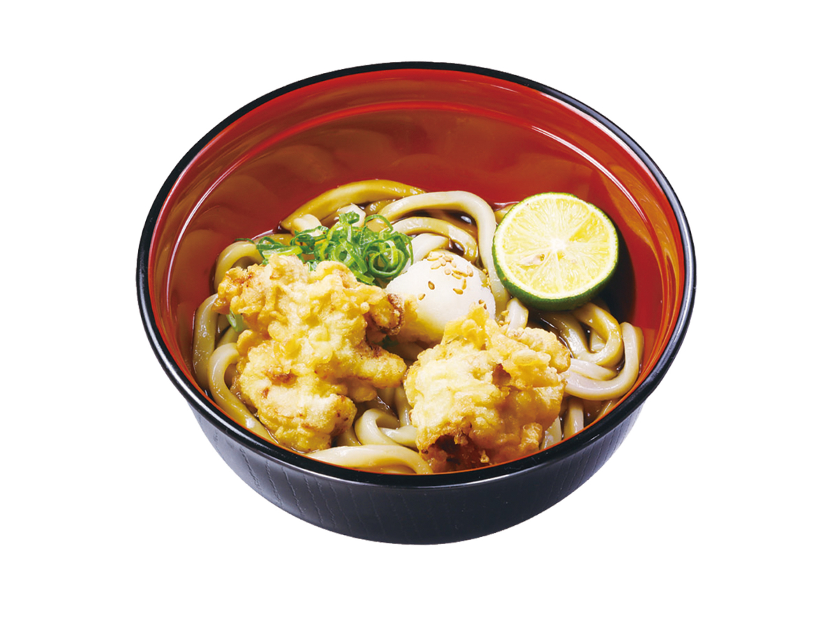 くら寿司特製のうどんつゆを使用したぶっかけうどんに、徳島県の特産でもある阿波尾鶏の天ぷらをトッピング。