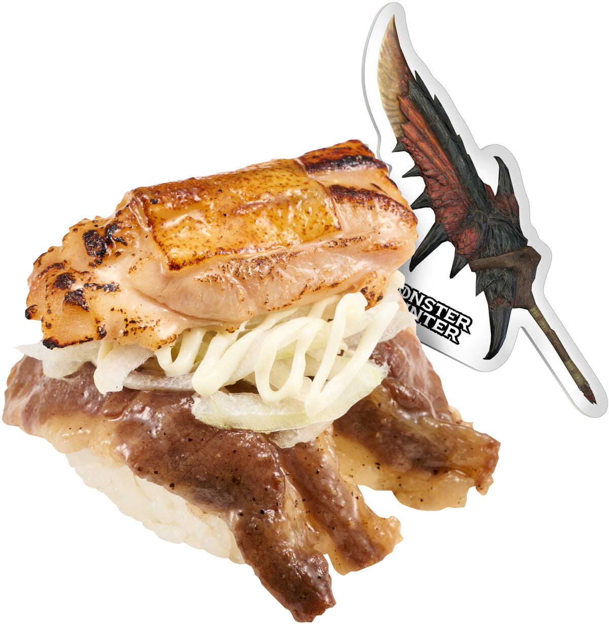 「モンハン 討伐報酬の炙り肉盛り」は、牛塩カルビに玉ねぎスライス、マヨネーズ、その上にチーズをのせて炙ったグリルチキンを重ねたスタミナ満点の肉すしです!