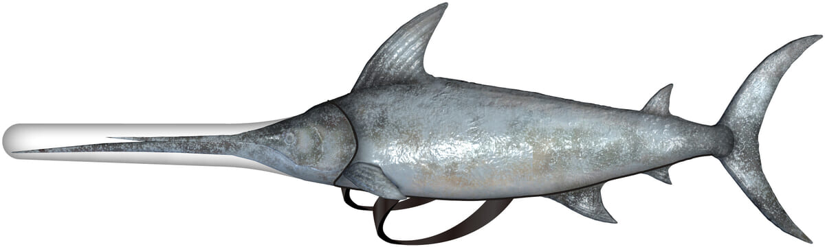 インパクト抜群の、全長約1.8mの「レイトウマグロ大剣リュック」
