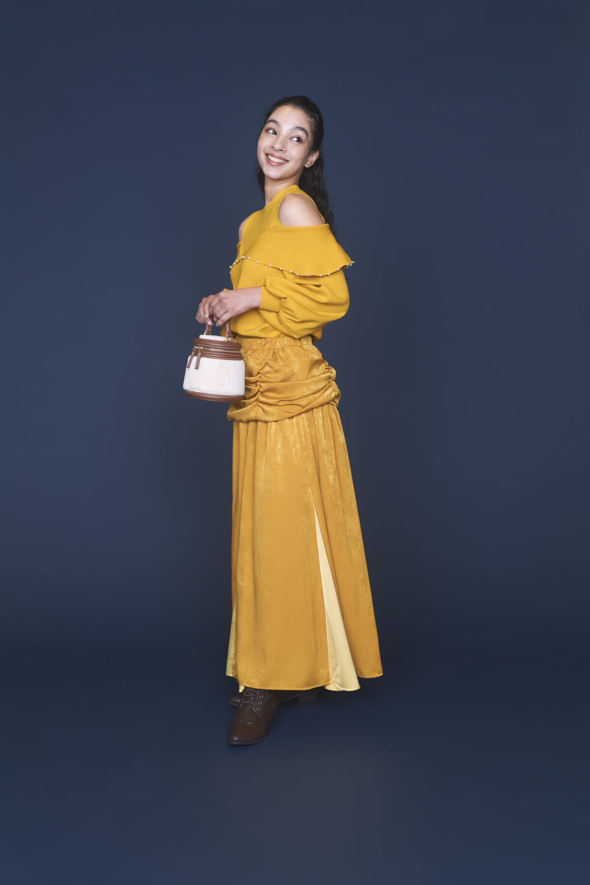 濃淡の異なる黄色を取り入れることで、コーデ全体に動きが出るように見せることができます。