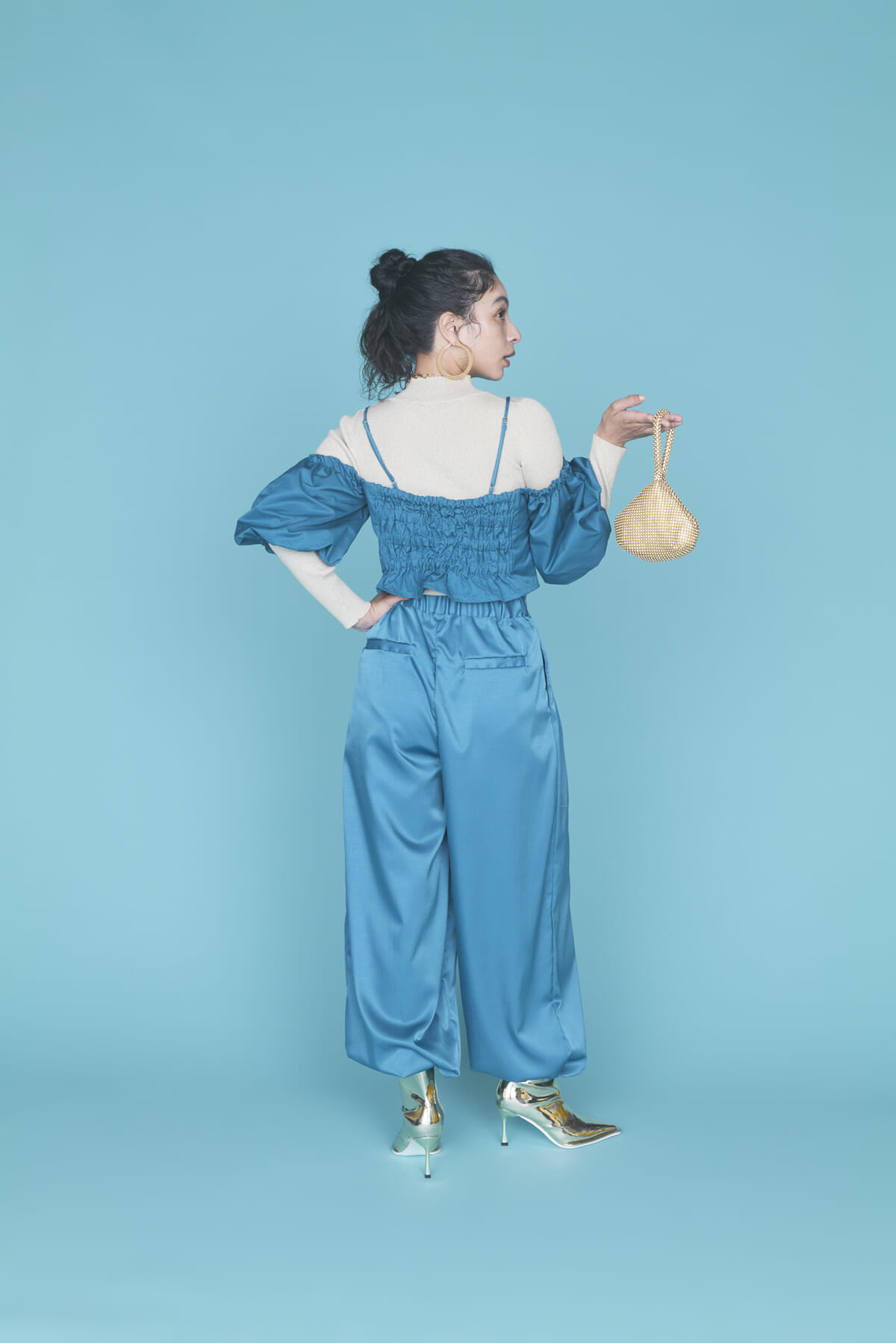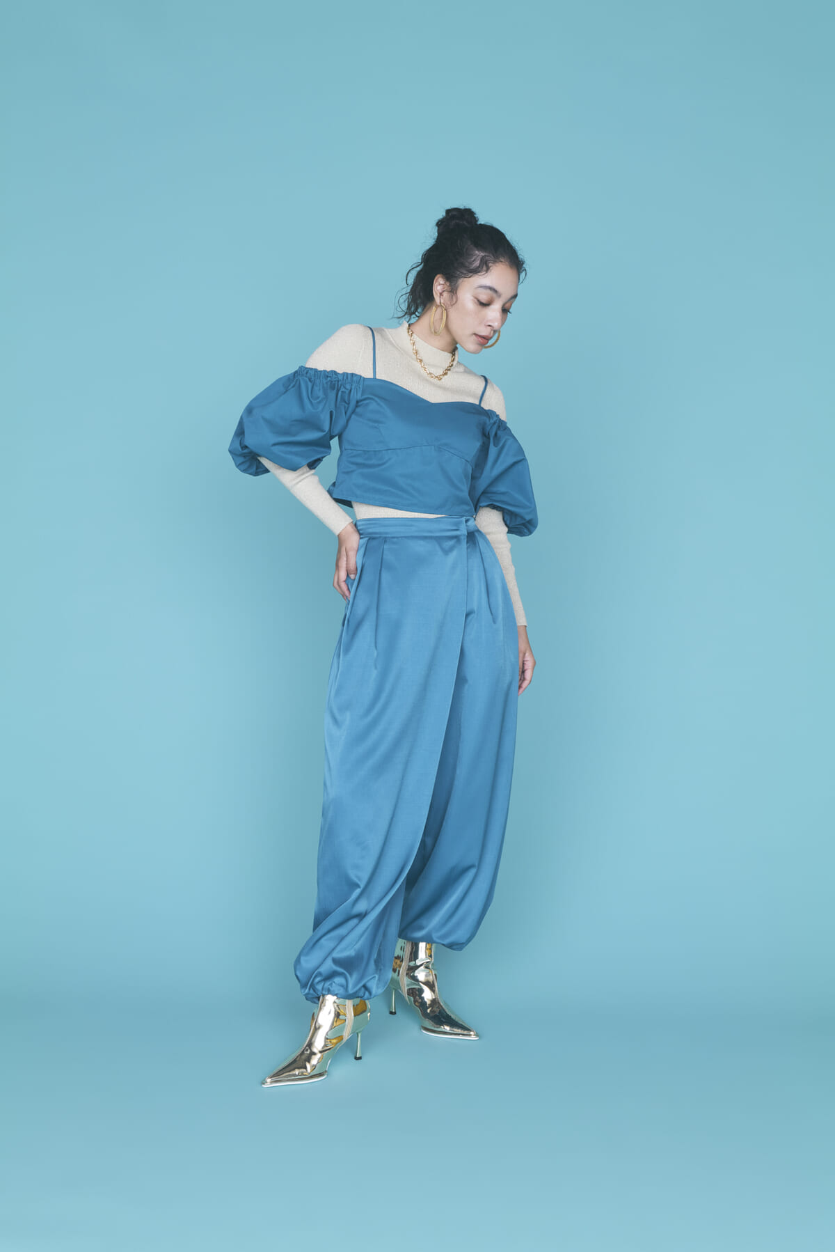 ワイドシルエットのパンツとオフショルダーのトップスは、スタイリッシュなセットアップとして楽しめます。