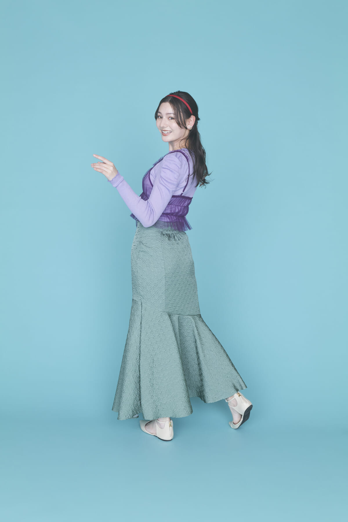 スカートは美しいシルエットが楽しめるロング丈のマーメイドスカート。