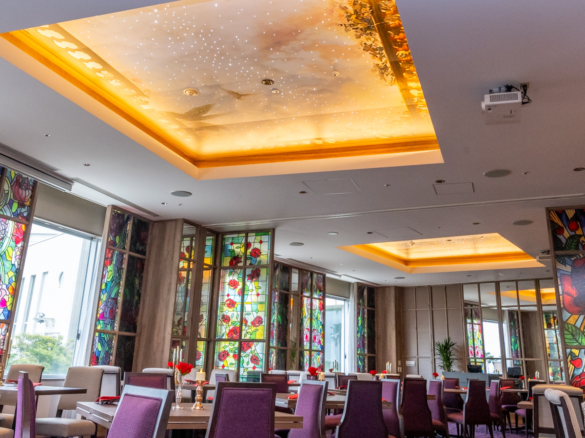 「フルール」は荘厳な雰囲気のお城のメインダイニング、「ソレイユ」は美しい街の活気あふれる朝のマルシェをイメージし、それぞれ天井には美しい空の風景が広がるレストラン。