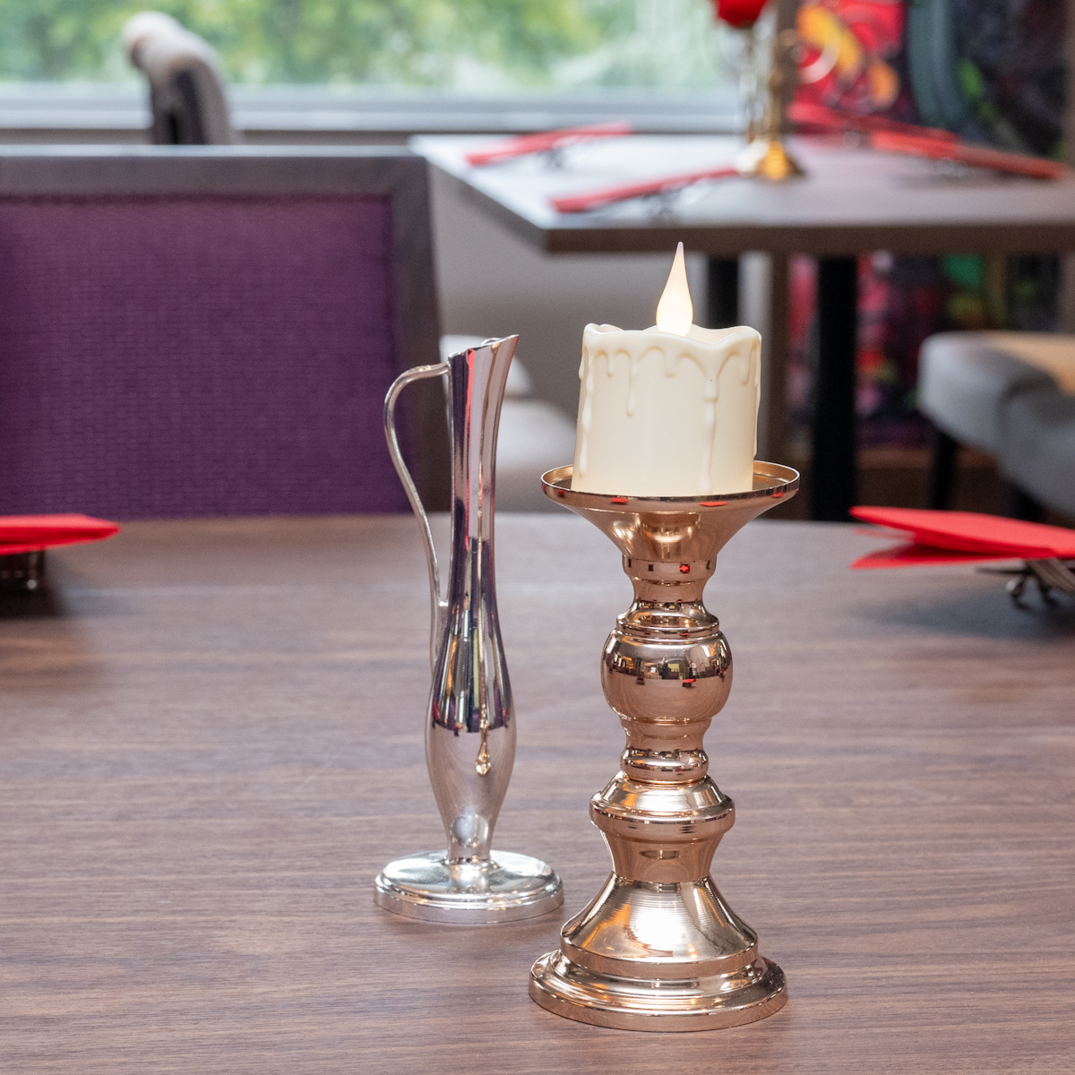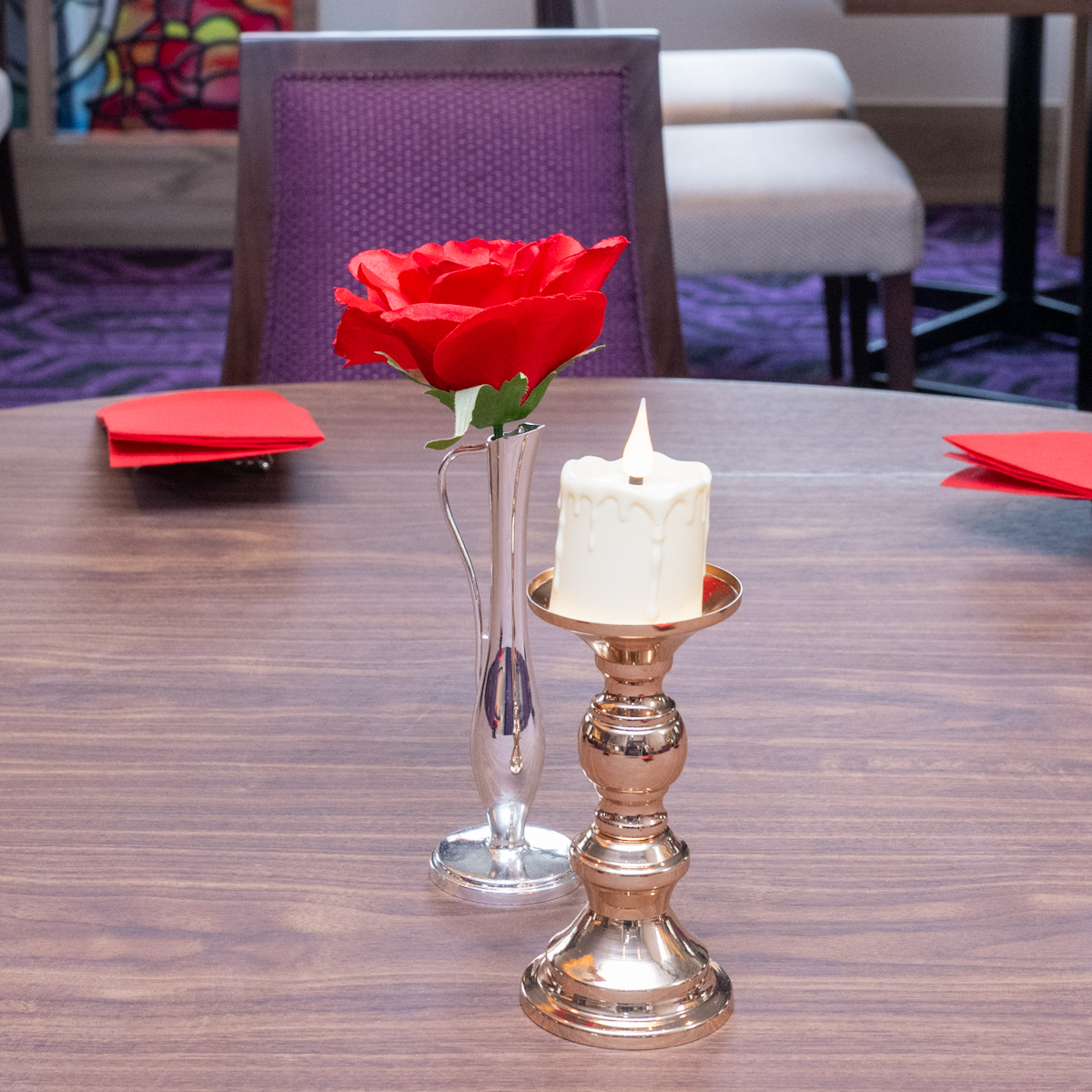 ローズのモチーフがひときわ目を引くステンドグラス風の装飾やキャンドルの温かな照明が煌めくドラマティックなシーンが演出されます。