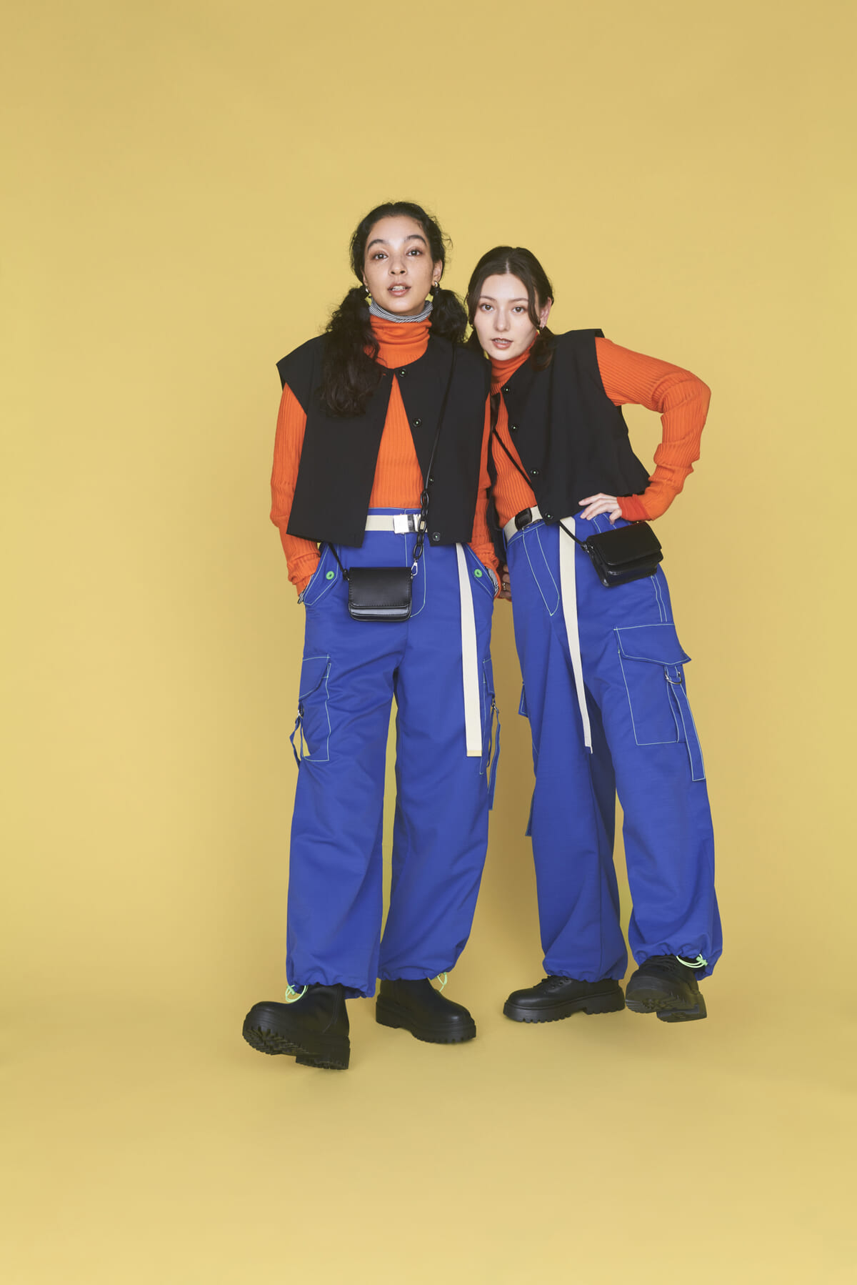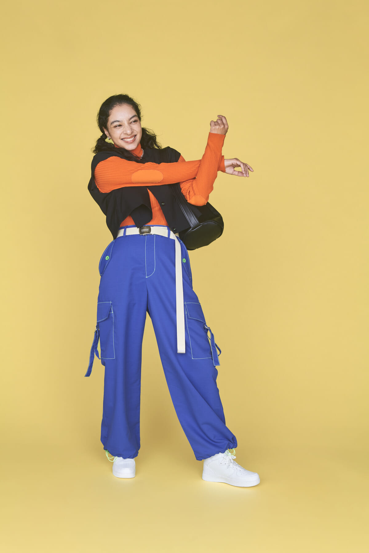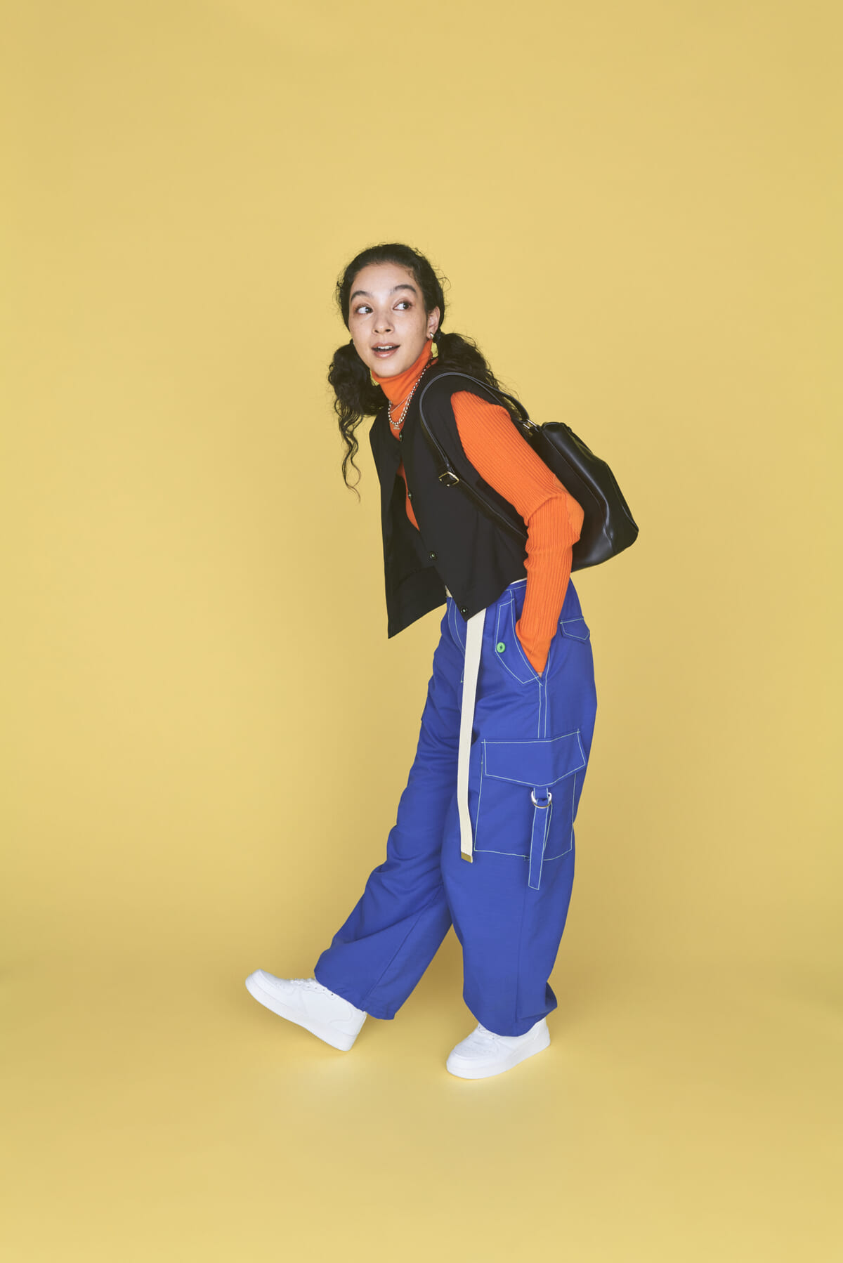 かわいらしいシルエットを、トレンド感のあるパラシュートパンツで表現しています。