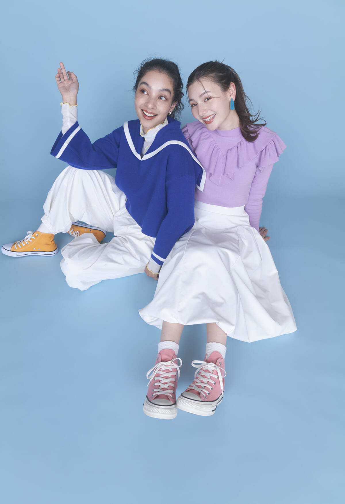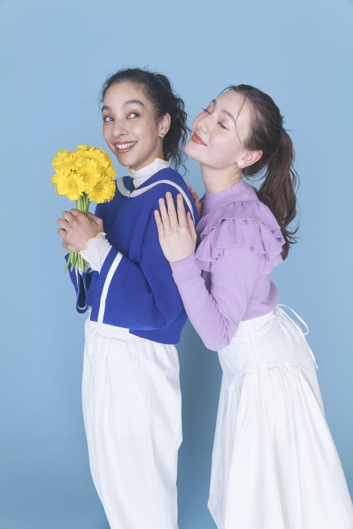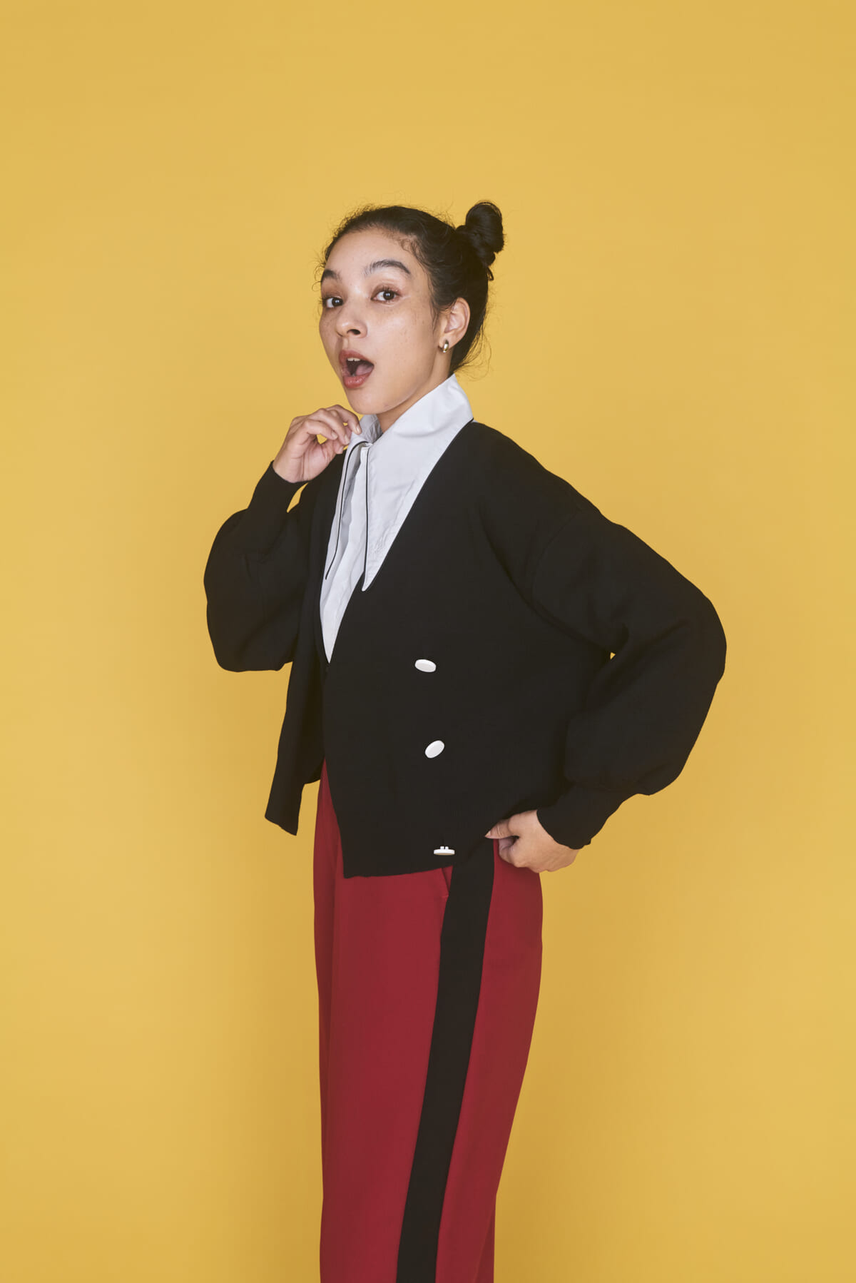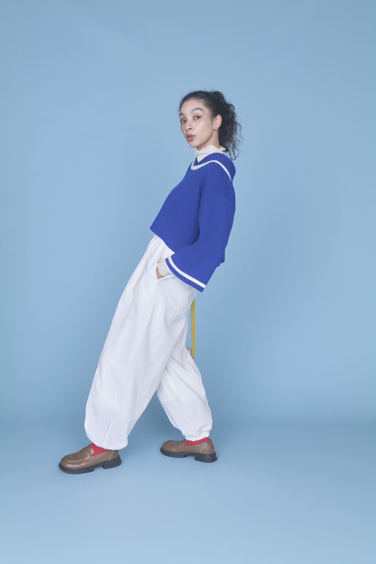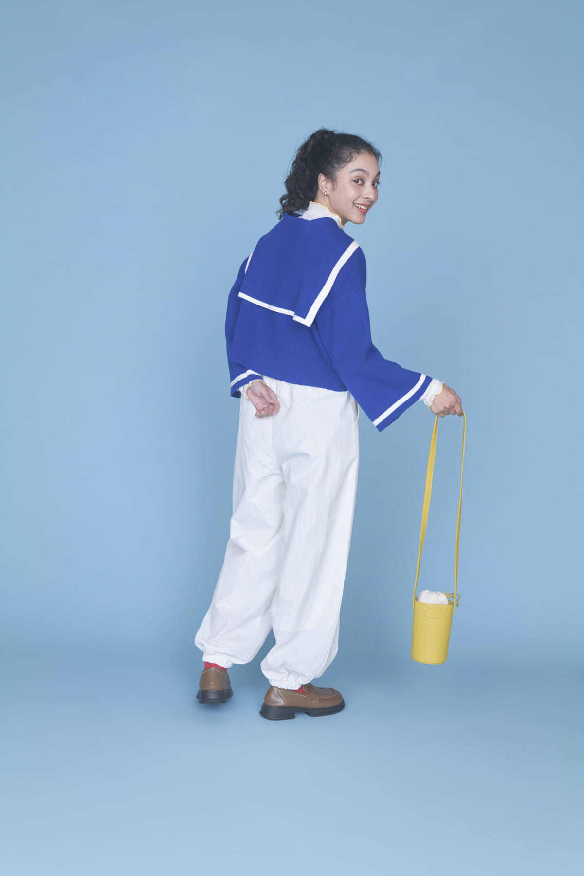 ニットはセーラー服の要素を取り入れたユニークなデザインに。