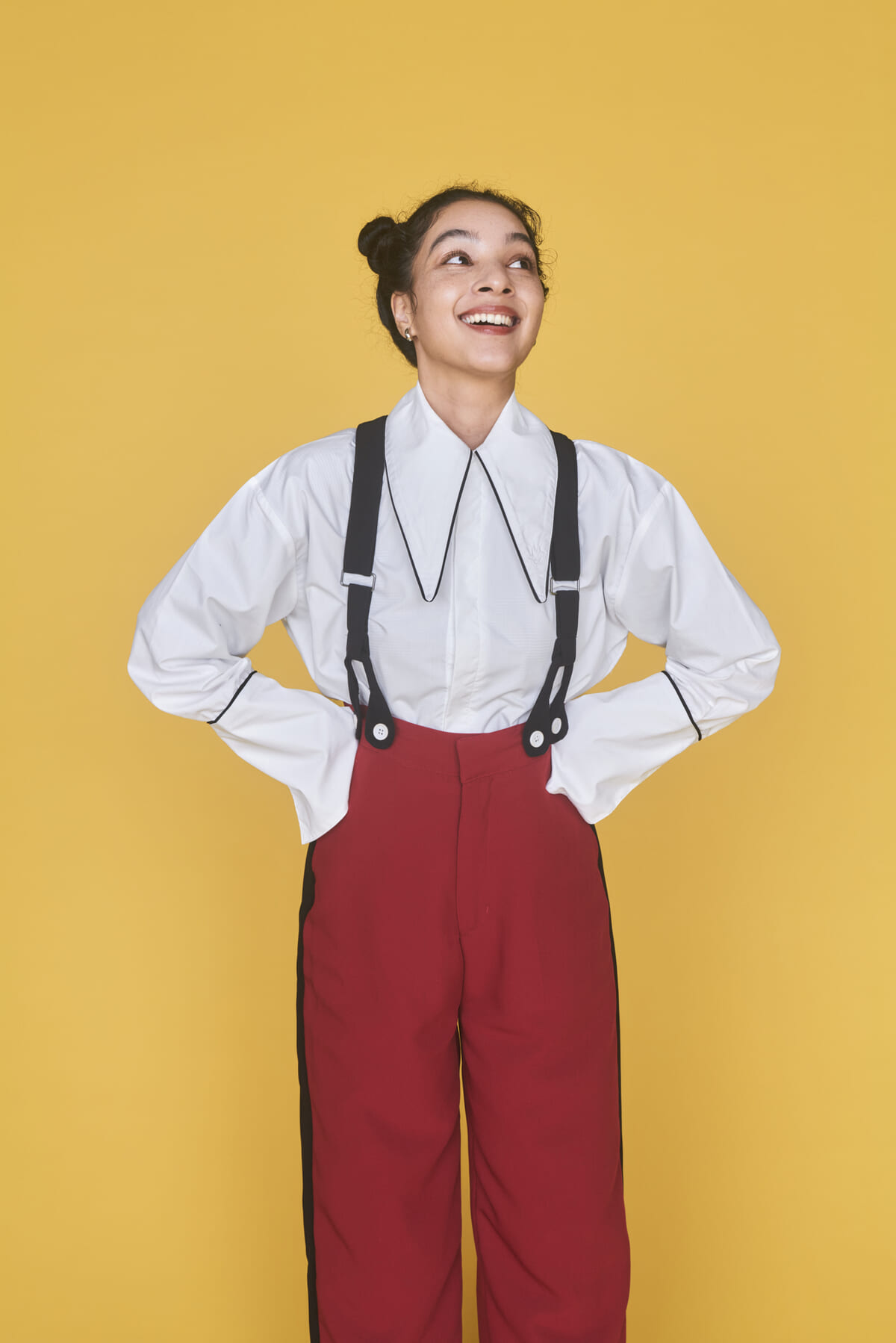 サスペンダー付きのオーバーサイズのパンツシルエットと大きな襟でトレンド感をプラス。