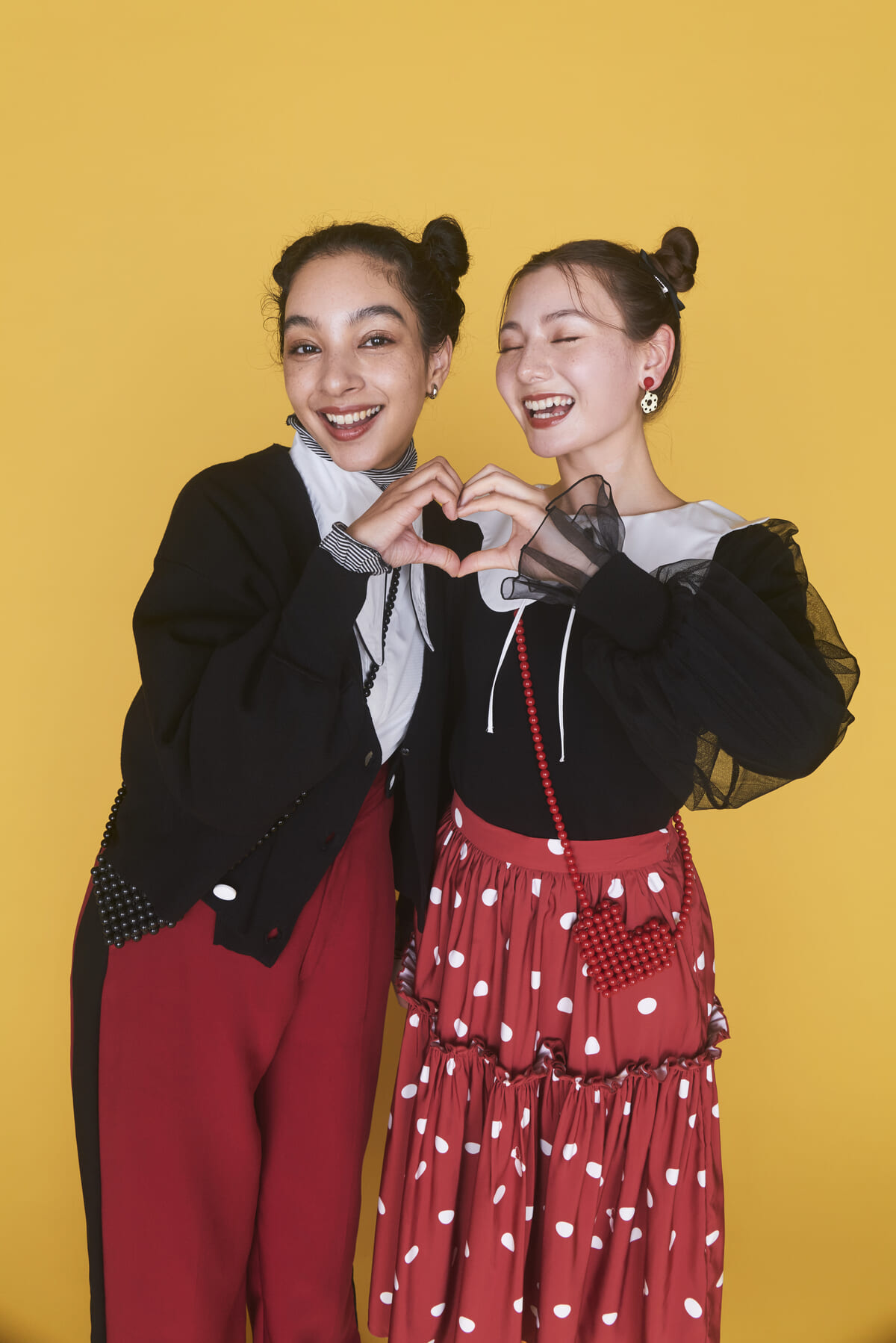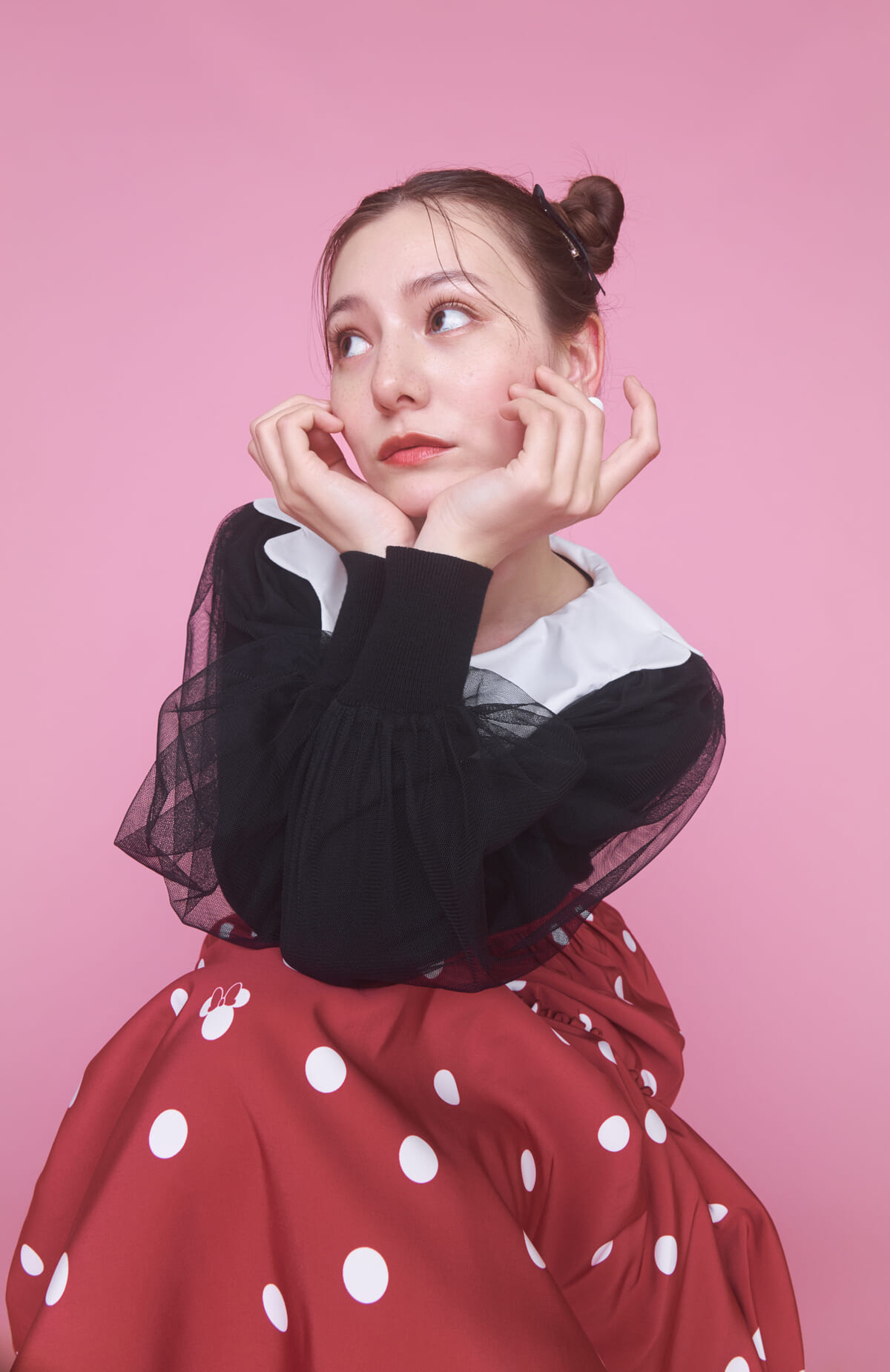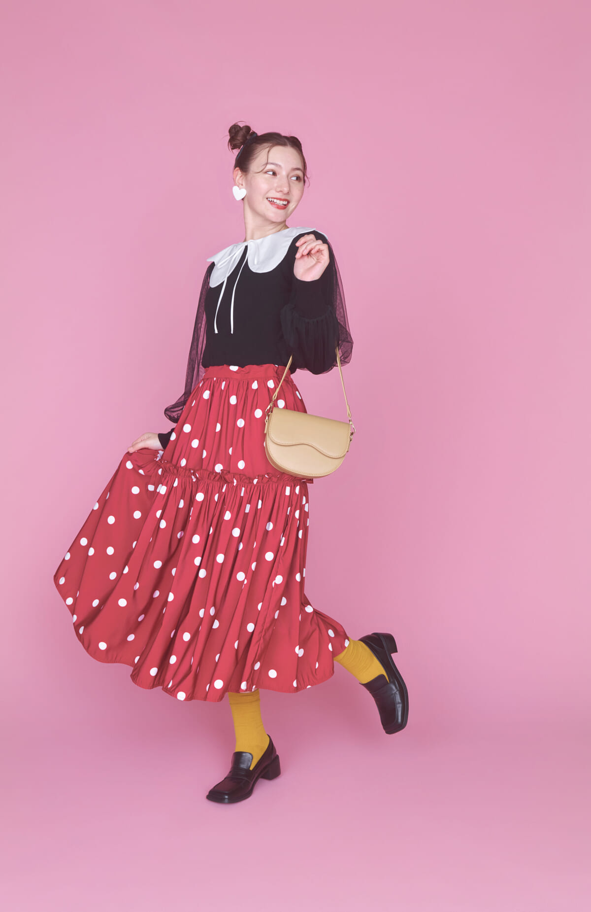 ボリューム感のある赤い水玉模様のスカートが印象的。