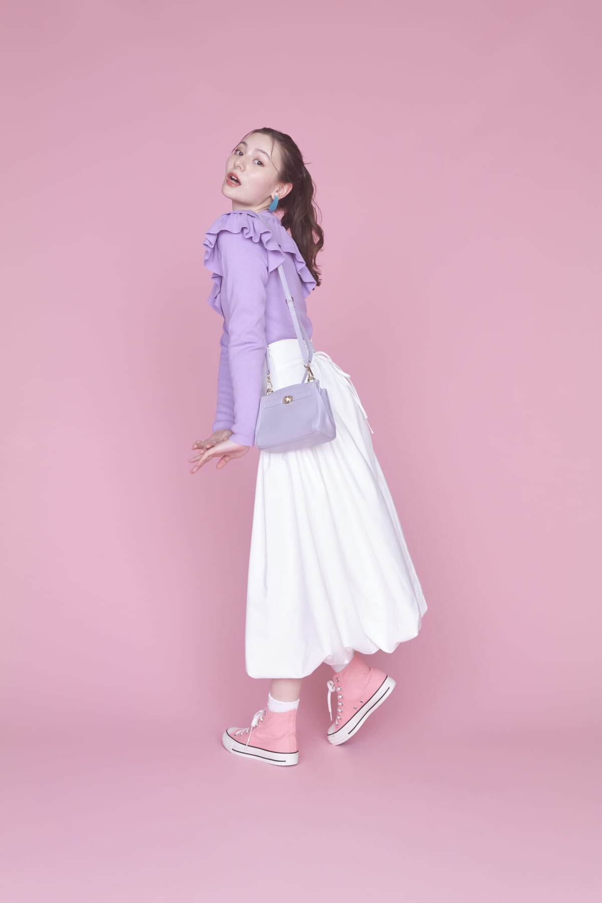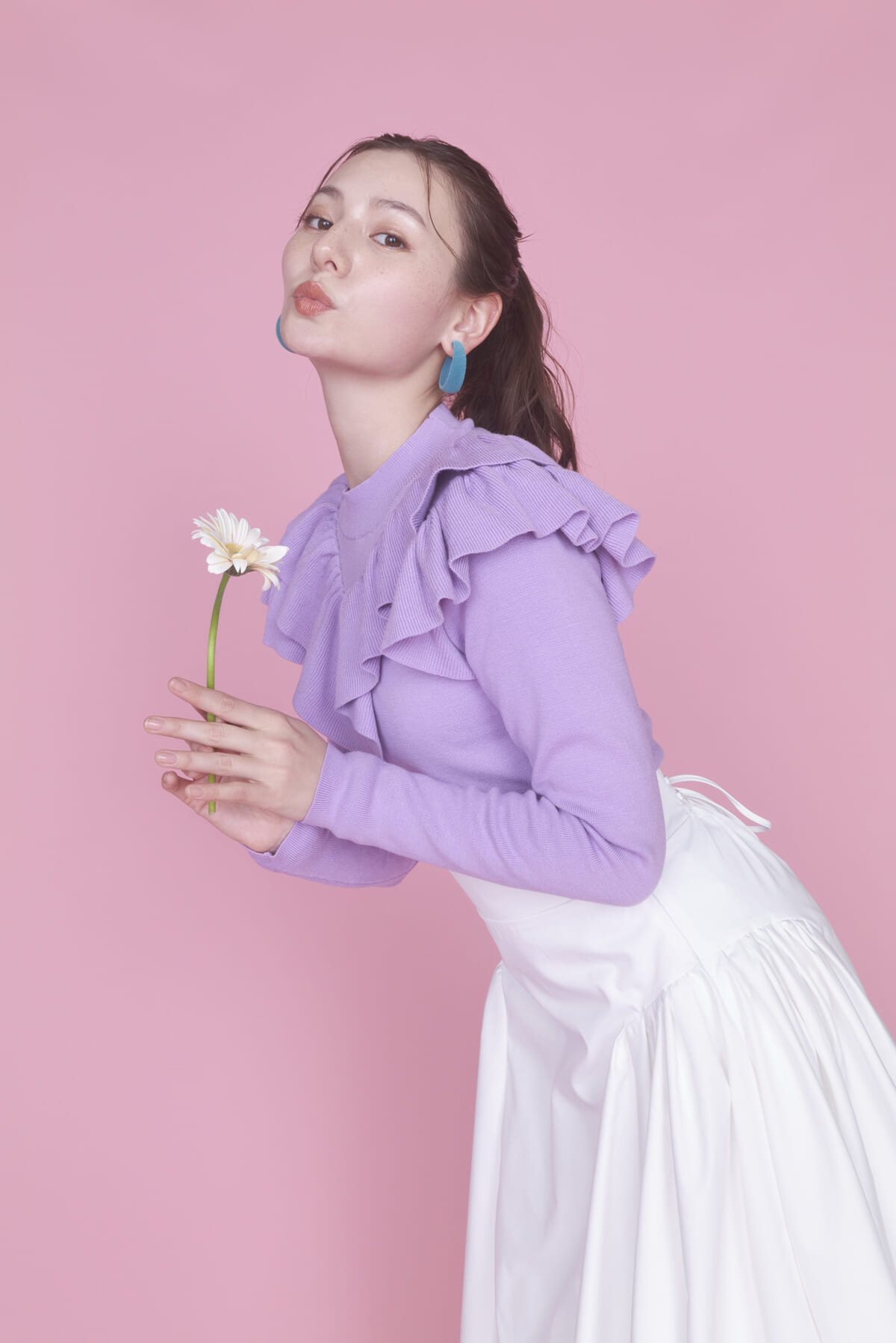 スカートがふわっと広がるかたちなのでトップスは視線が上に集まるように工夫されています。