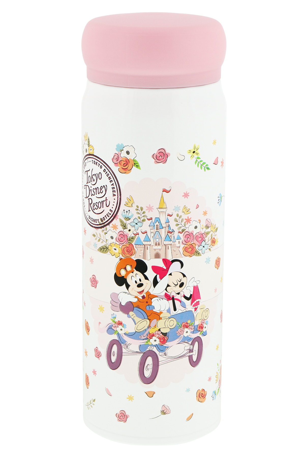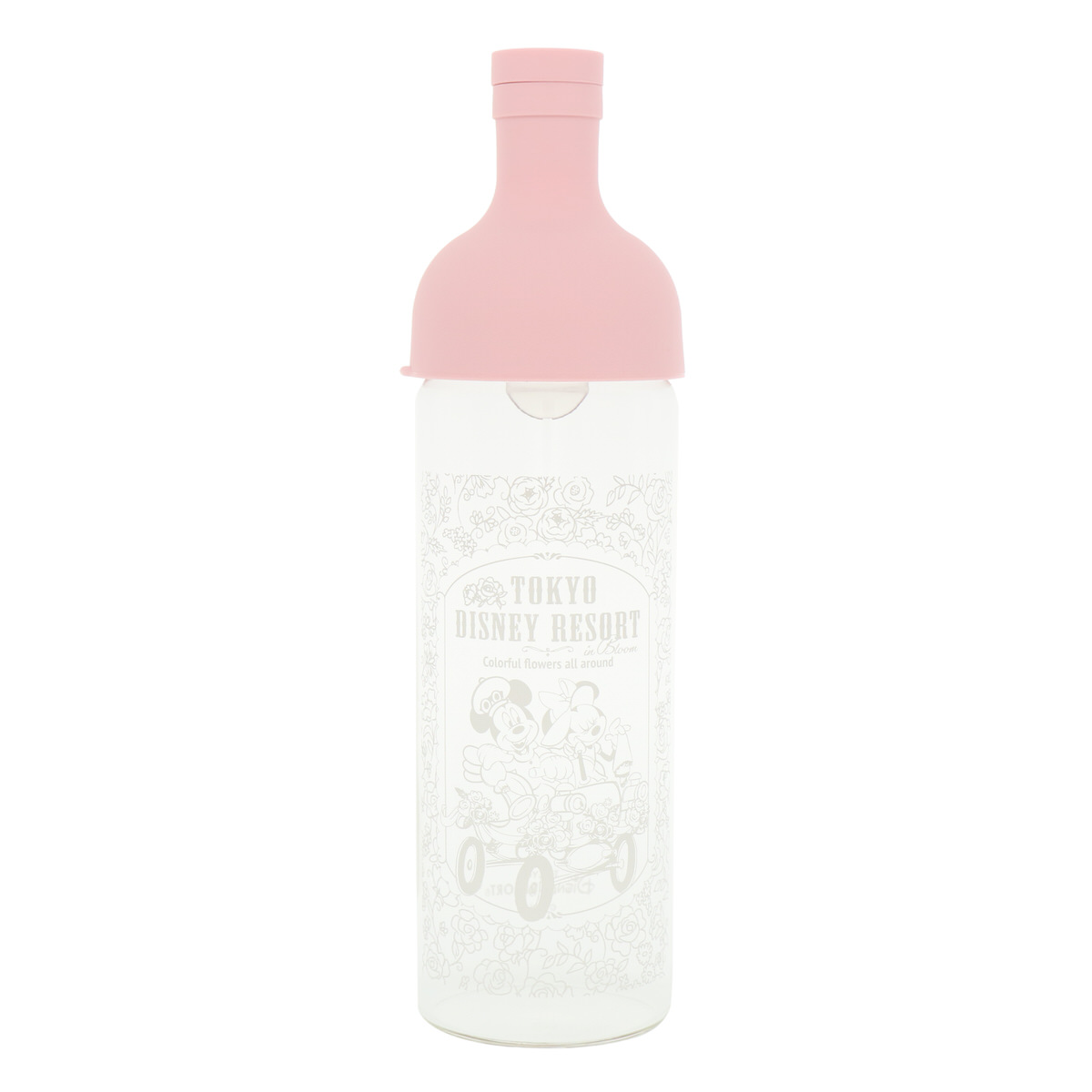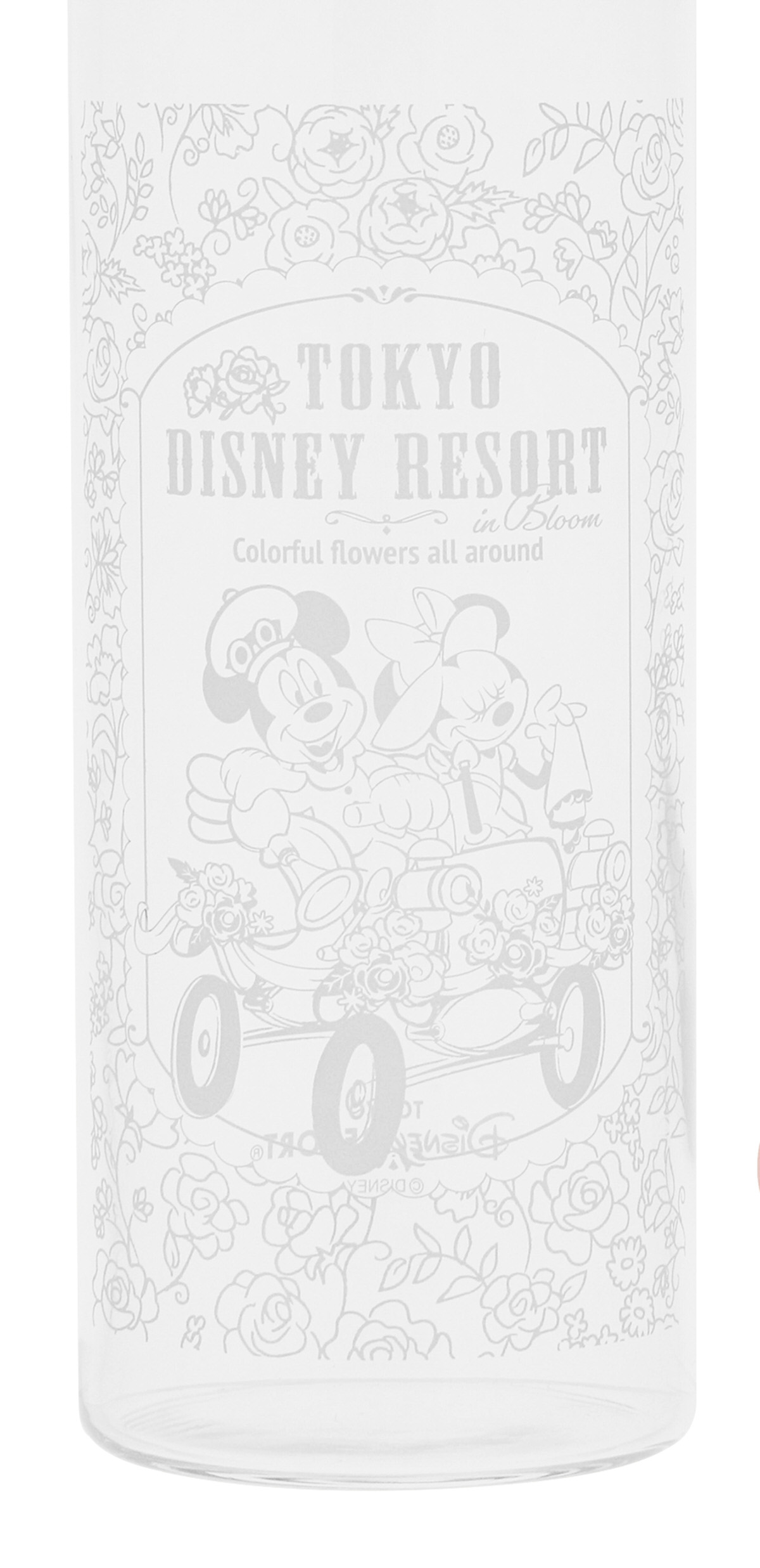 花咲き誇るパークを満喫するミッキーたちが描かれた耐熱ガラスボトル。