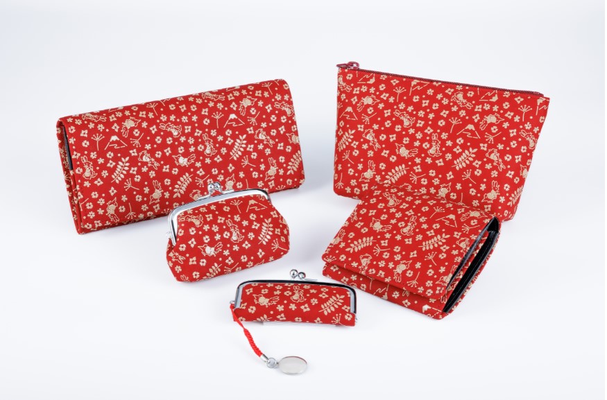 富士山やお花と共に「ピーターラビット」を落とし込んだ、オリジナル絵柄の「甲州印伝」