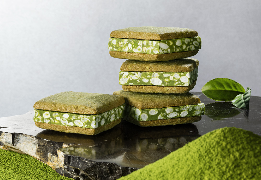 刻みナッツと米パフを盛って ざくざく響く贅沢食感を創りあげ、お抹茶マカダミアクッキーにはさんでいます。