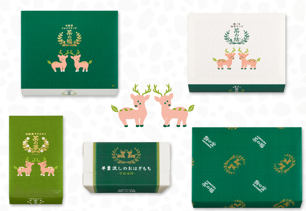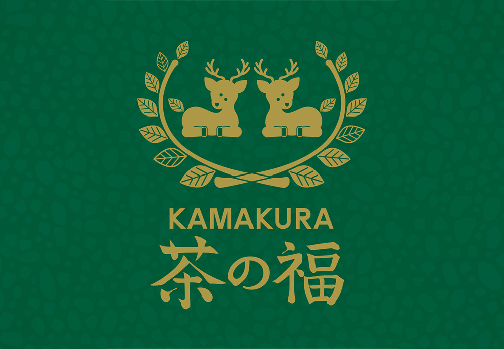 「KAMAKURA 茶の福」の門番、ふたごの福鹿「菓の鹿~カノカ」と「茶の鹿~チャノカ」のロゴマークもかわいらしい、新しいお抹茶スイーツのお店です!