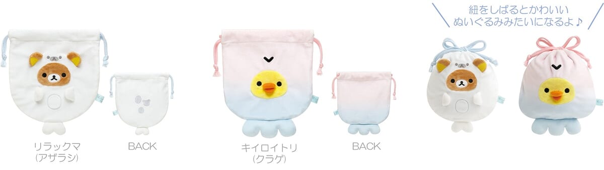 アザラシになった「リラックマ」や、クラゲになった「キイロイトリ」のぬいぐるみ巾着。