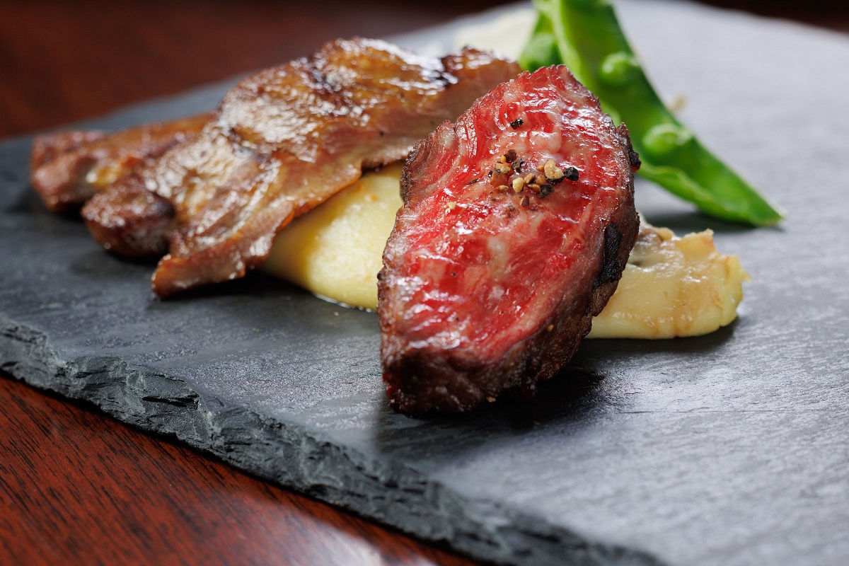 メインディッシュは、A5等級の仙台牛ランプ肉に名物の牛たんを添えた豪華な一皿。