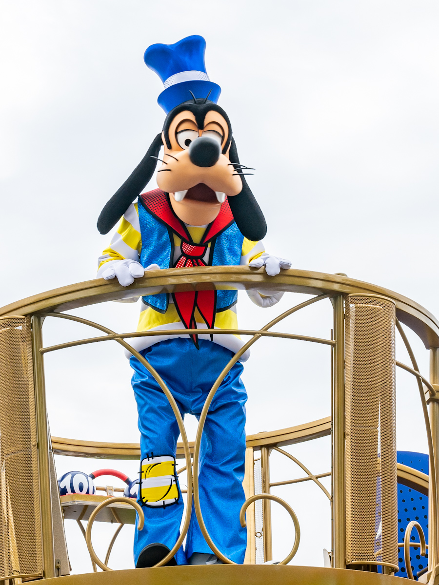 グーフィーはマッスル界のドナルドダックを称えるフロートに乗っています。