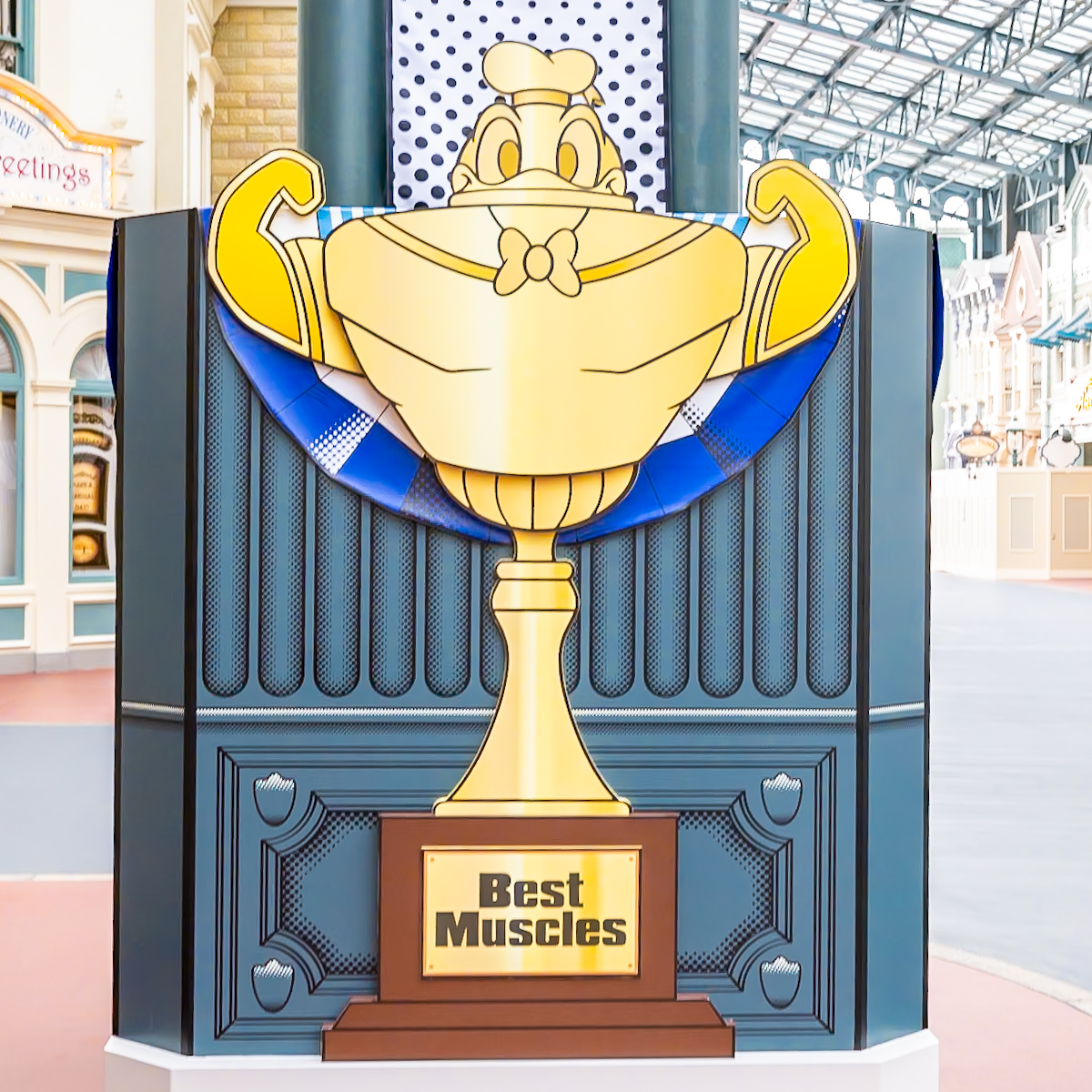 黄金に輝くドナルドの像と、トロフィーやメダルを持って嬉しそうにしているドナルド。