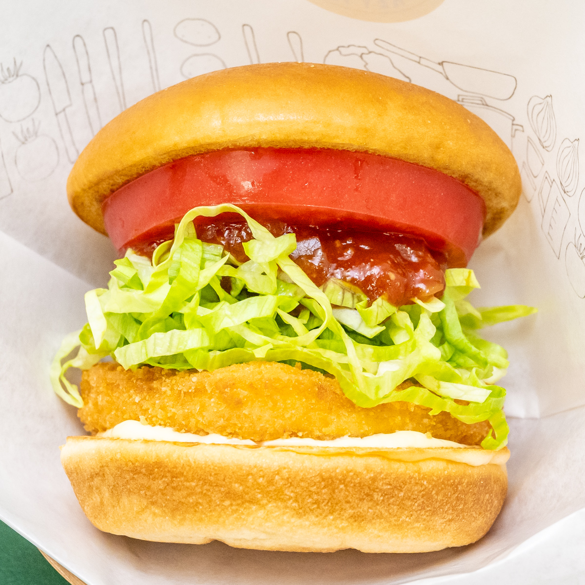 鶏むね肉のチキンフライに細切りのレタスを乗せ、ピリ辛のホットソースと輪切りトマトを合わせたハンバーガー。