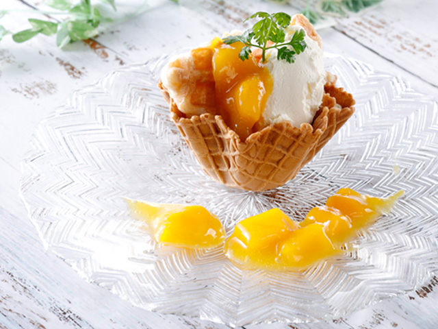 外はザクザクのワッフルコーン、中はもっちり食感のクロッフルにマンゴーの甘みと、口の中で溶けるマスカルポーネが生み出すハーモニーが楽しい1品です。