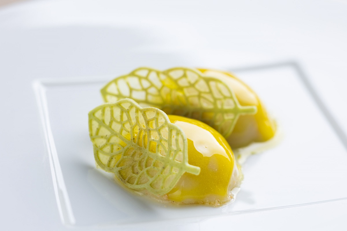 デザートで提供されるのは、植物性の材料のみで作られたレモン香るホワイトチョコレートのブランマンジェ。