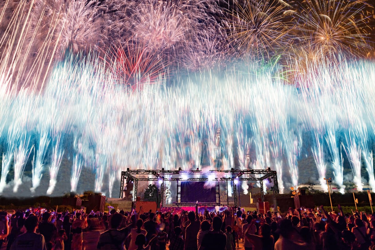 日本の伝統色として古くから日常に溶け込んでいる柔らかな中間色の花火が、熱を肌に感じるほど目の前で打ちあがり、エモさ溢れる楽曲と重なることで、ゲストの心をあたたかく懐かしい世界へと引き込みます。