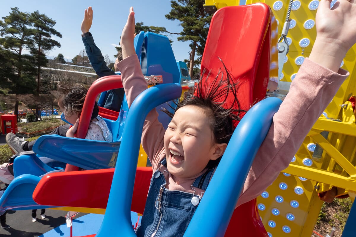 親子で一緒に乗ってはしゃげるブランコ型アトラクション「スイング・スイング」、10mの高さまで上昇し回転とバウンドを繰り返す「スプリング・ライド・タワー」、