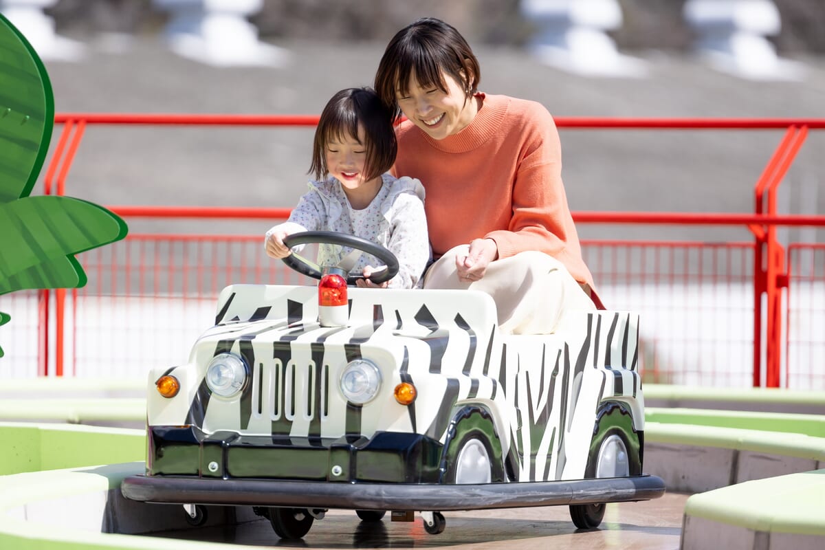 絵本のようなジャングルの世界を自分で運転する「ジャングル!ドライブ」のライド・アトラクション3機種に加え、こどもの想像力を刺激する楽器のようにたたいて音を鳴らす「ミュージック・フラワー」など、全部で13種類の体験が楽しめます!