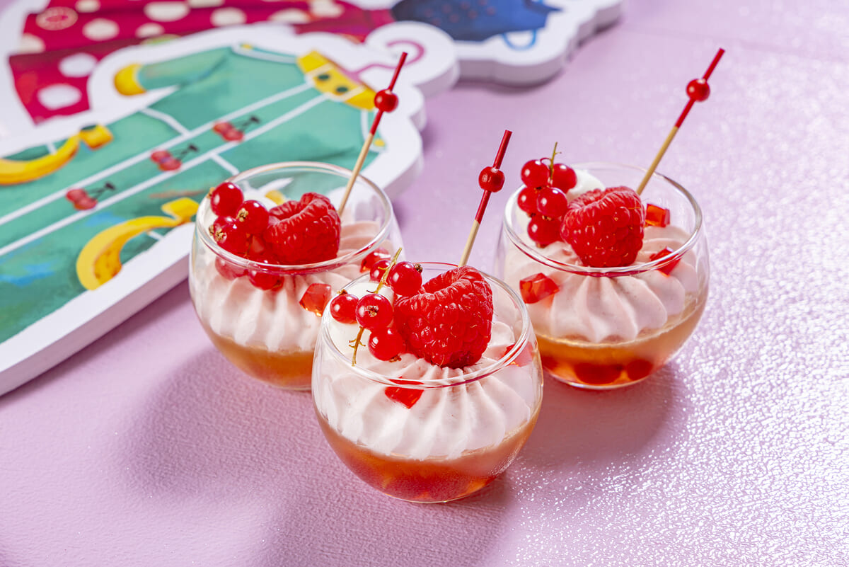 まるで梅のキャンディのような味わいのグラススイーツ「梅子ちゃんの初恋ゼリー」は大葉のゼリーの中にたっぷりの赤スグリと梅風味の白桃ムースが爽やかです。