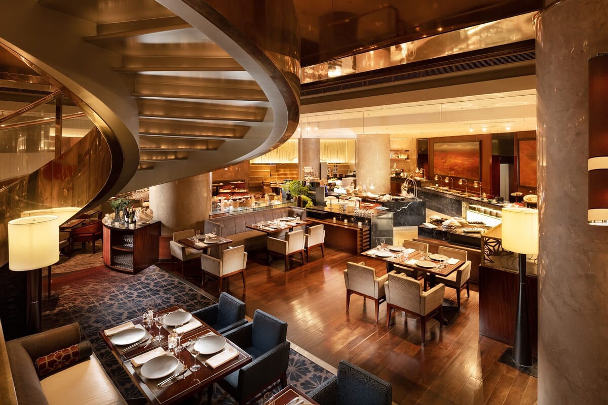ヒルトン東京1Fにある、中央にらせん階段を配し、2階まで吹き抜けの開放感あふれる「マーブルラウンジ」
