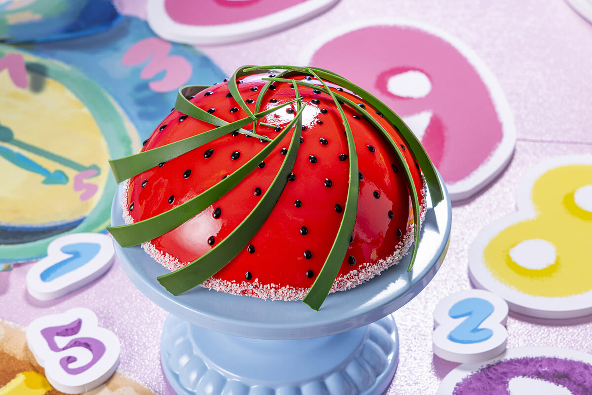 ヨーグルトムースにカンパリリキュールを利かせたジェノワーズとオレンジムース、スイカのコンフィチュールを忍ばせた「未来のスイカはこんな味?」や、