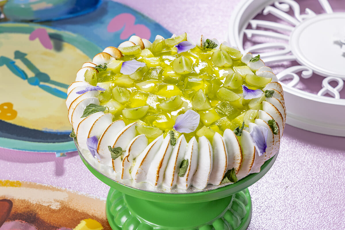 シャインマスカットゼリー入りアーモンドムースとローズマリー風味のマスカットゼリーの組み合わせにとたっぷりのシャインマスカットを冠した「未来永劫マスカットの世界線」、